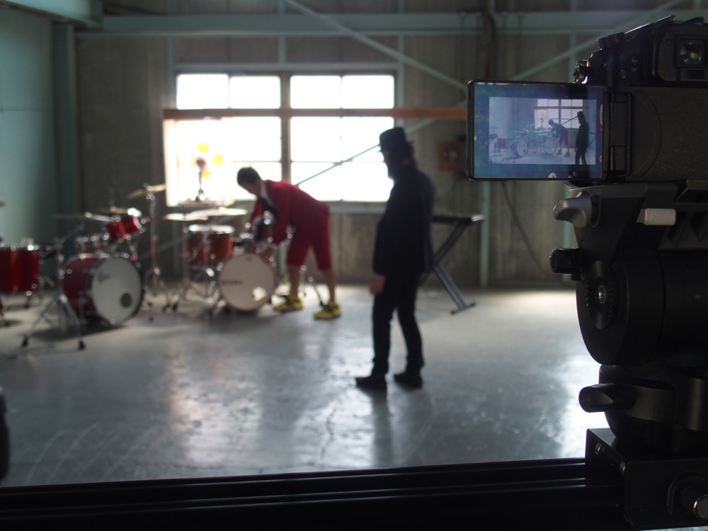 出演人数が多いだけに、楽器の立ち位置は重要です。カメラアングル的にどう見えるのか…、勿論格好良い見え方を優先させたいですが、全てのメンバーが見える位置付けにしないといけません。2ドラム、2ベースという、なかなか前例の無い編成なので(笑)、時間をかけて検討しつつ、そして撮影に入りました。