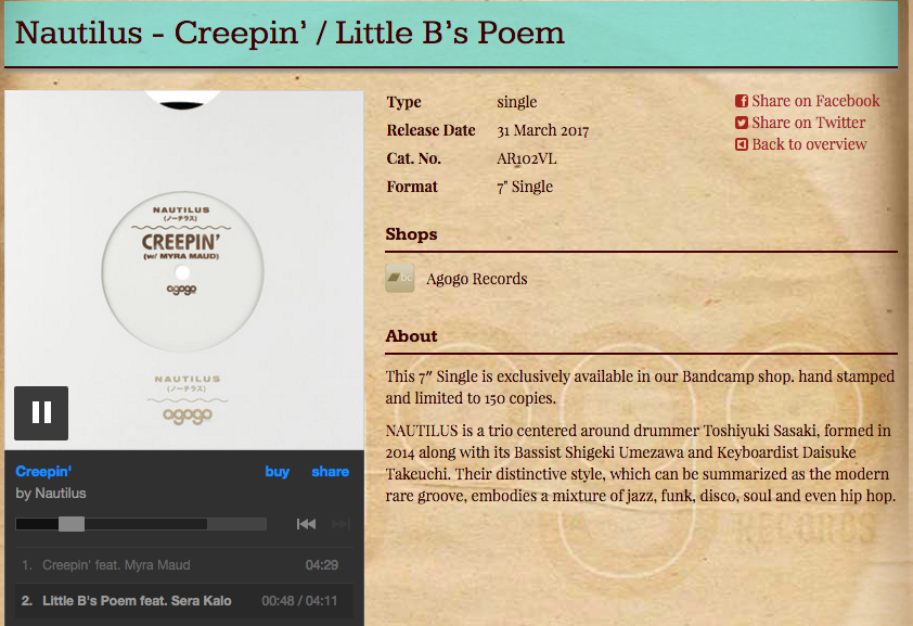 さて、こちらのサイトを見ていくと分かるように、6月23日(金)には『agogo records』よりフルアルバムのリリースも決定しております!…所謂日本版の Nautilus CDアルバム2作品の中から、厳選された12曲が収められていますので、こちらも併せてチェックしてみて下さい(既に予約注文を受け付けています)。