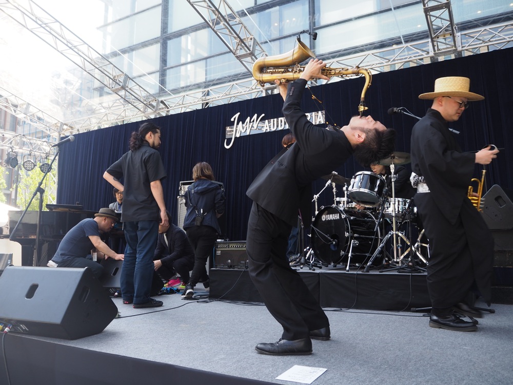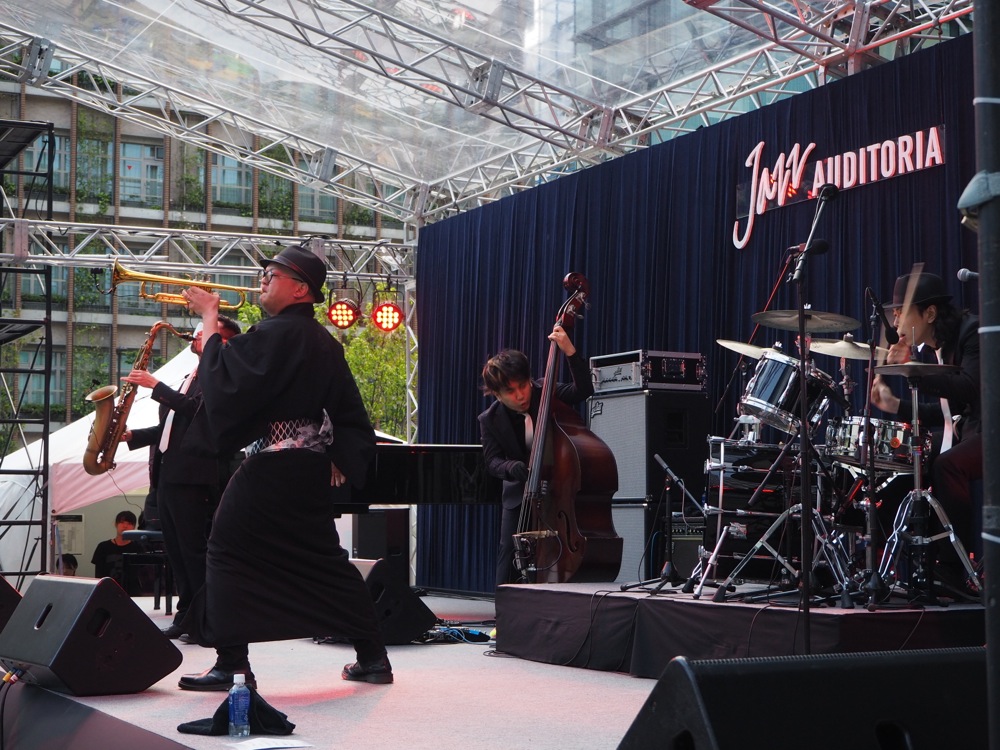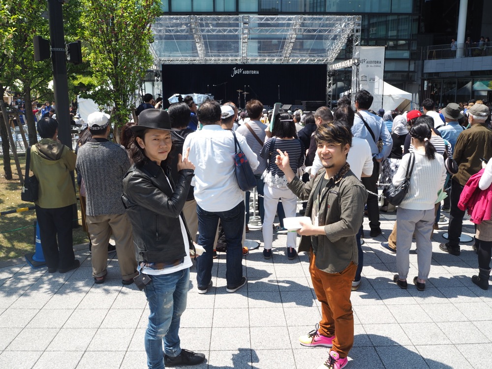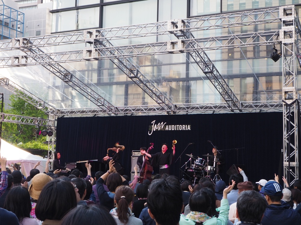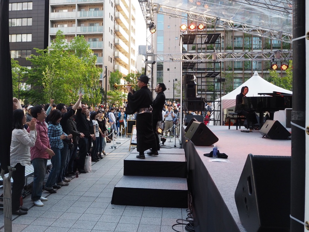 当日は好天に恵まれました。神田淡路町の新しい複合施設“ワテラス(WATERRAS)”内の広場にステージは造られ、緑の多い場所も相まってか、近代的なビル群の中に現れた都会のオアシスのような雰囲気がそこにはありました。ステージの前には沢山のベンチシートが揃えられていましたが、ここは午前中に配布される整理券が必要な席らしく、あとは基本的には周りでの立ち見になるそうです。