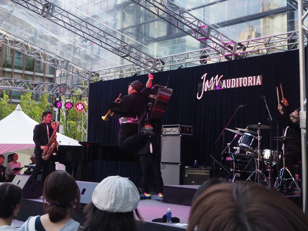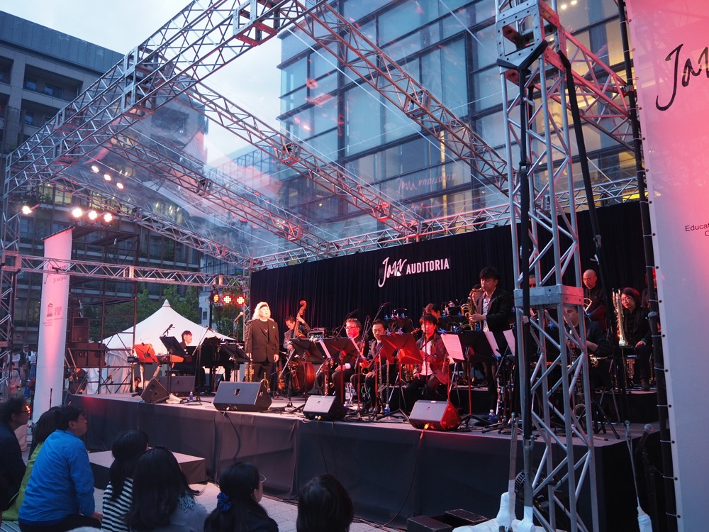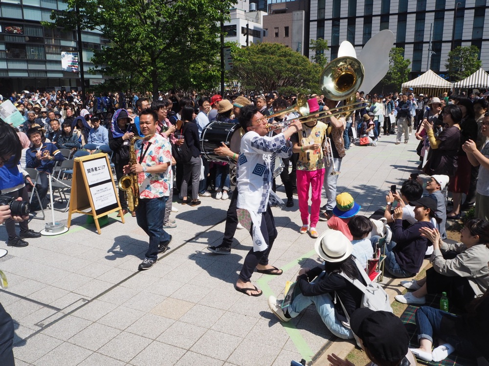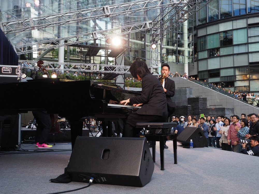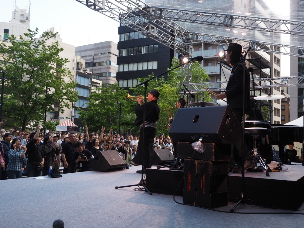 当日は好天に恵まれました。神田淡路町の新しい複合施設“ワテラス(WATERRAS)”内の広場にステージは造られ、緑の多い場所も相まってか、近代的なビル群の中に現れた都会のオアシスのような雰囲気がそこにはありました。ステージの前には沢山のベンチシートが揃えられていましたが、ここは午前中に配布される整理券が必要な席らしく、あとは基本的には周りでの立ち見になるそうです。