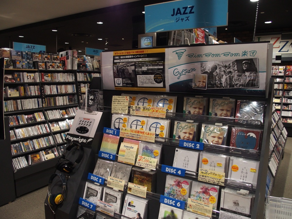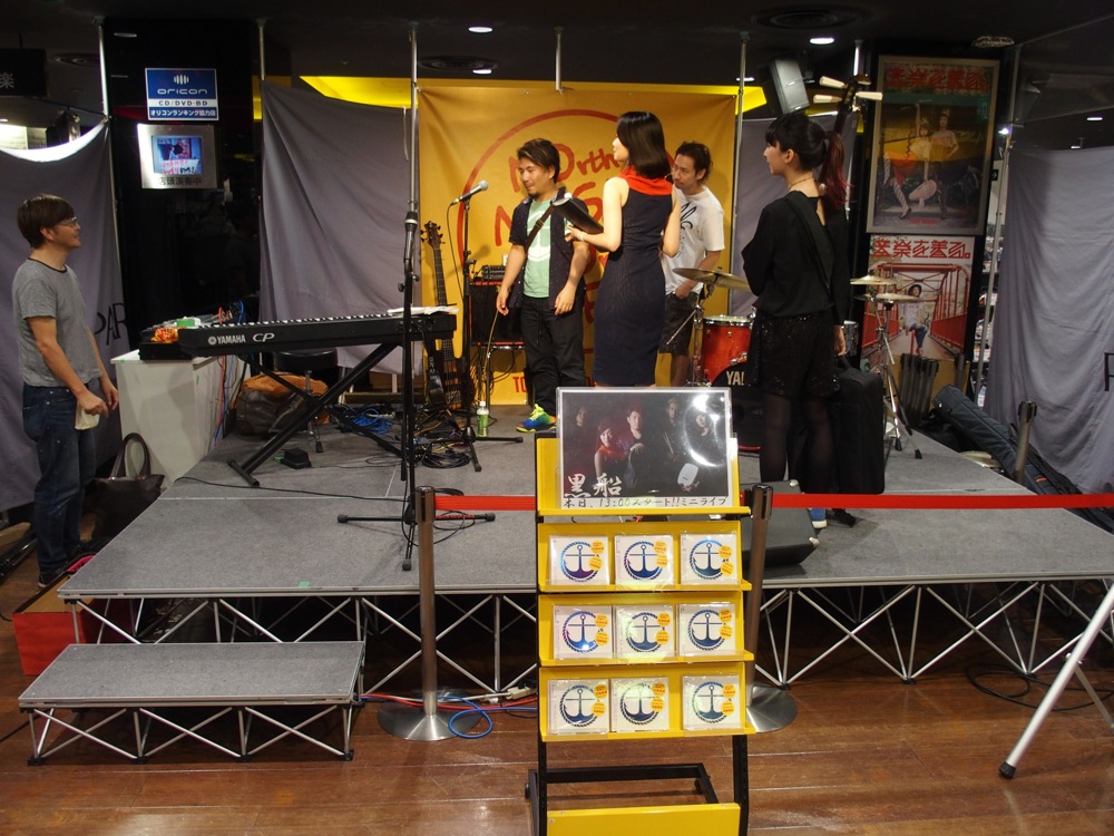 そして、非常に眠いという事を除いて、仙台には順調に到着しました。当然の事ながら、仙台に着くなり、もうインストアライブの準備です。既にお店でのステージ設置はして貰っていましたが、ここから楽器をセッティングしていかなければなりません。なかなかタイトな時間ではありましたが、売り場で展開されている黒船のCDを確認して、自分達も頑張らねば!という気持ちにさせてくれます。このライブは、夜のワンマンライブに向けたプロモーションでもあります。気合いを入れて臨みたいものです。