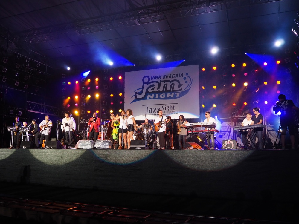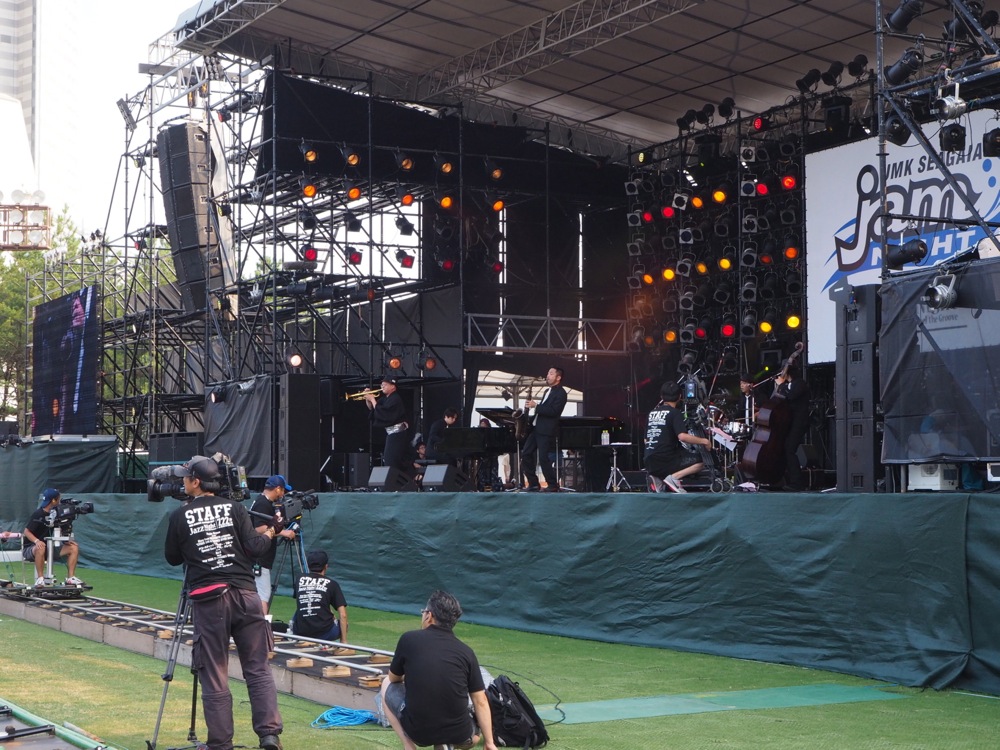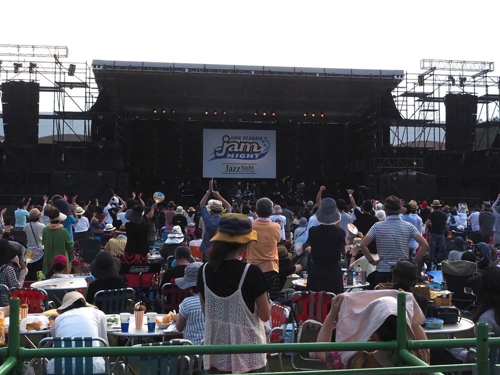 会場は、宮崎シーガイアのエリア内にある広大な敷地を利用しており、巨大なステージがまず目に飛び込んできて驚かされたものでした。これまでの自分達の中でも屈指の巨大なステージであり、客席エリアだったと思います。自分達のパフォーマンスも、この広大なスペースをどのように使ったら良いか連日頭を悩ませていたものですが、ついに実践する日がやってきたのです。このイベントはここ何年か、Jazz Night(ジャズ系中心)と、Juke Night(ロック、ポップス系中心)の2日間に分けられており、自分達の出番は Jazz Night の一番手…。数ある諸先輩方のバンドから見たら、当然の順番でもありますが、あとは思い切り演奏させて頂きました。全部で約40分のステージ、お楽しみ頂けたでしょうか。