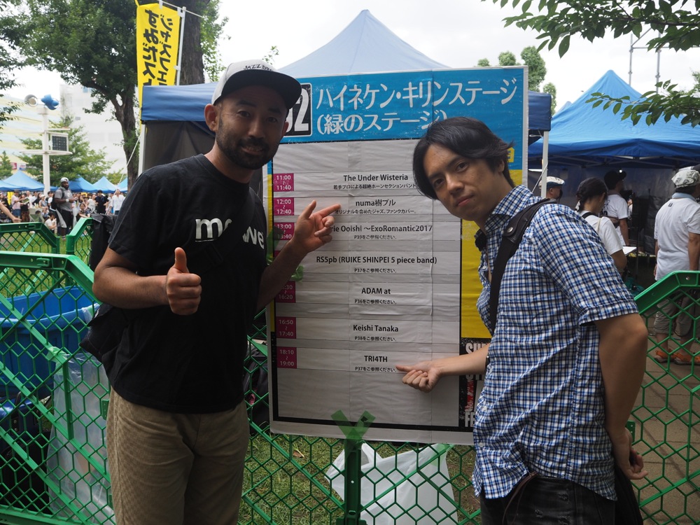 東京スカイツリーを横目に見ながらのステージである「緑のステージ」は、TRI4TH が今まで多く、すみだジャズで出演してきた事のあるステージでもあり、一番馴染みのあるステージでもありました。今回もこのステージに立てて光栄であると共に、トリである事で、前述のような責任感も芽生えてきます。会場に着くと、ひと足早く ADAM at が正にステージを繰り広げているところで、お客さんも一緒になって盛り上がっている光景が飛び込んできました。そして、お昼頃に同じこのステージで出演してきたという、ベースの梅沢茂樹さんとも出会い、これぞジャズフェスという感じの出会い(笑)も沢山ありました。すみだジャズは自分の中で、もはや夏の風物詩の1つにもなっている気がします。