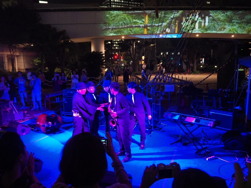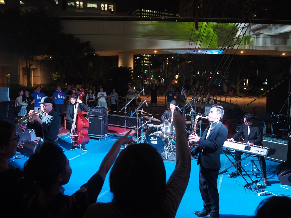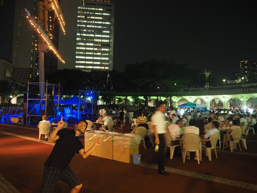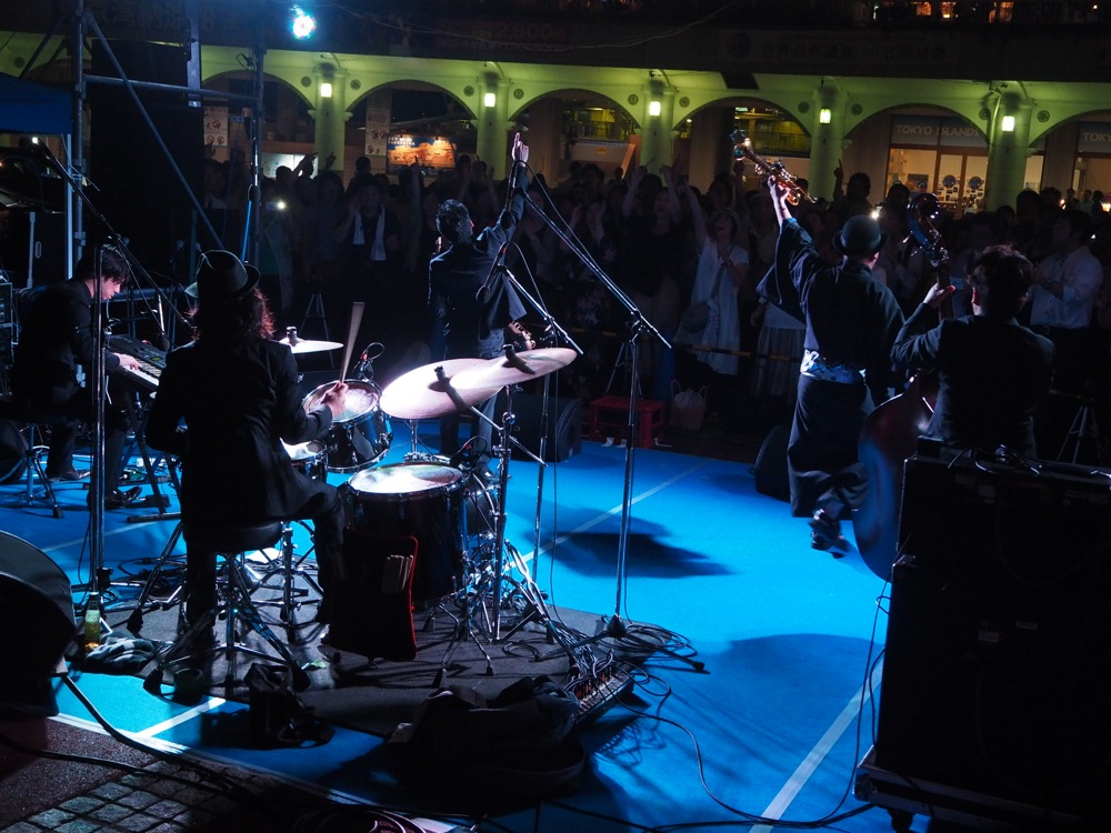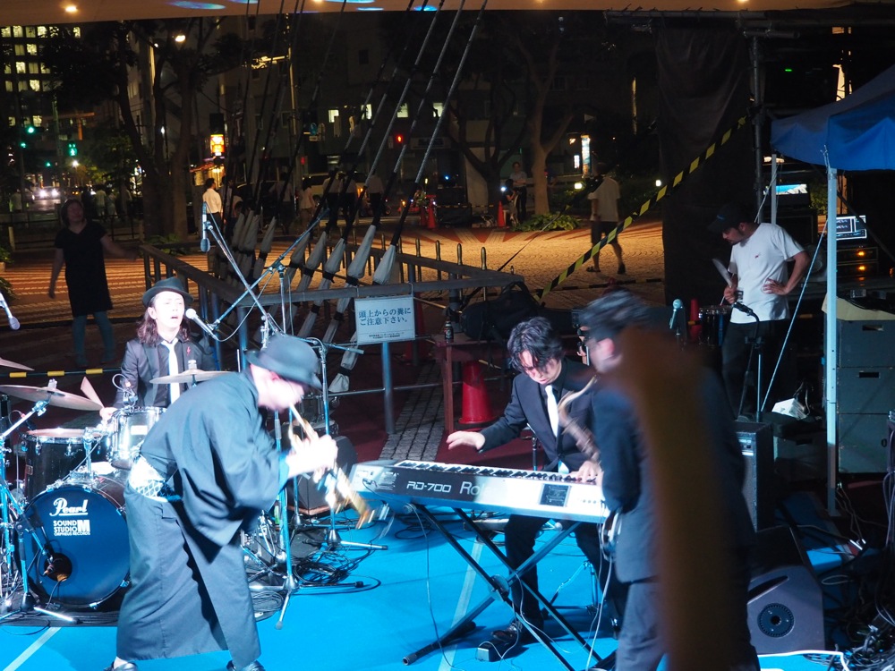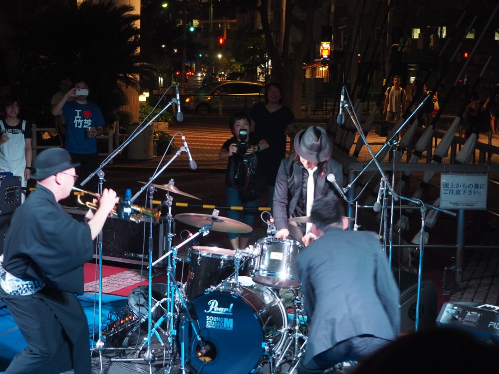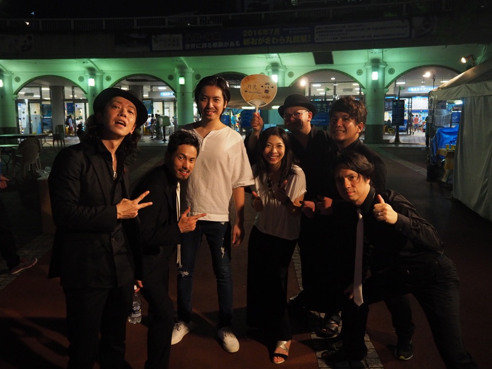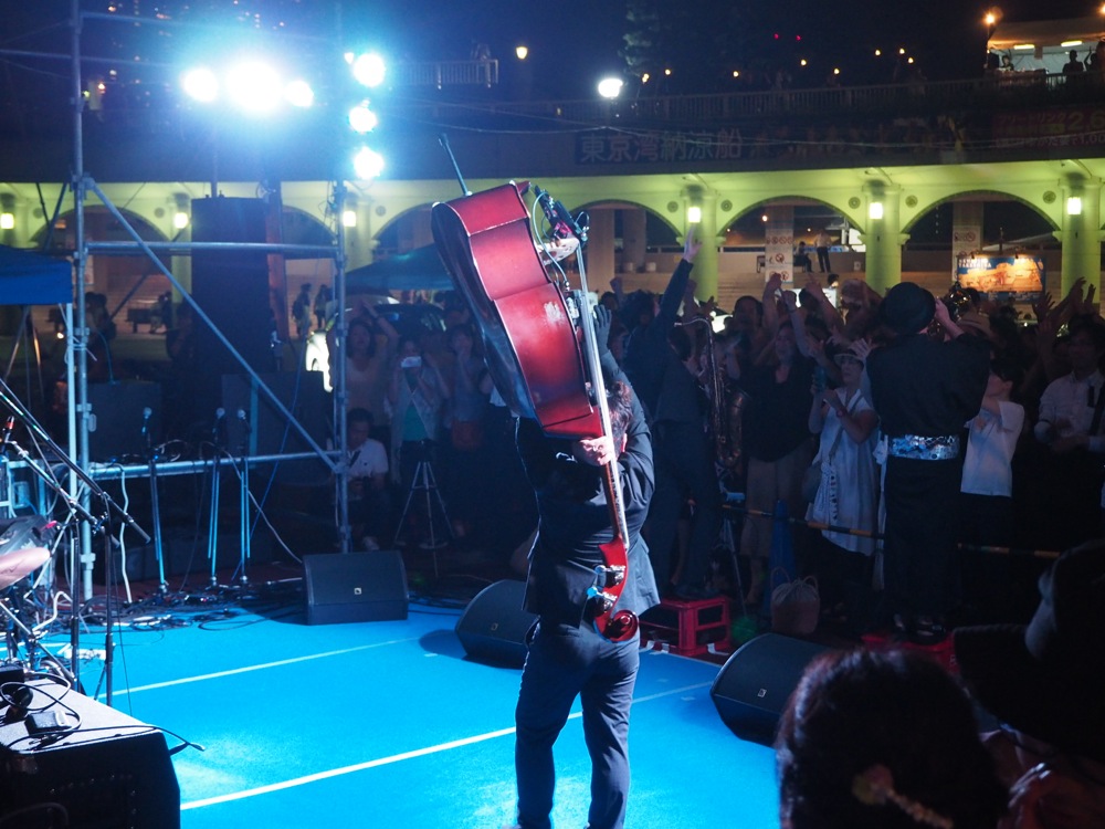 ライブは最高に盛り上がりました。自分達のライブの後半中だったでしょうか…。前述の東京湾納涼船が帰港し、そこからの沢山のお客さんも、自分達のステージに足を留めて見て下さっていて、盛り上がりは更にピークに達していきます。この日は本当に蒸し暑い夜だったのですが、そんな中でも負けずに皆で踊って頂けて嬉しかったです。CDの売り上げも好調でした。どうもありがとうございました!