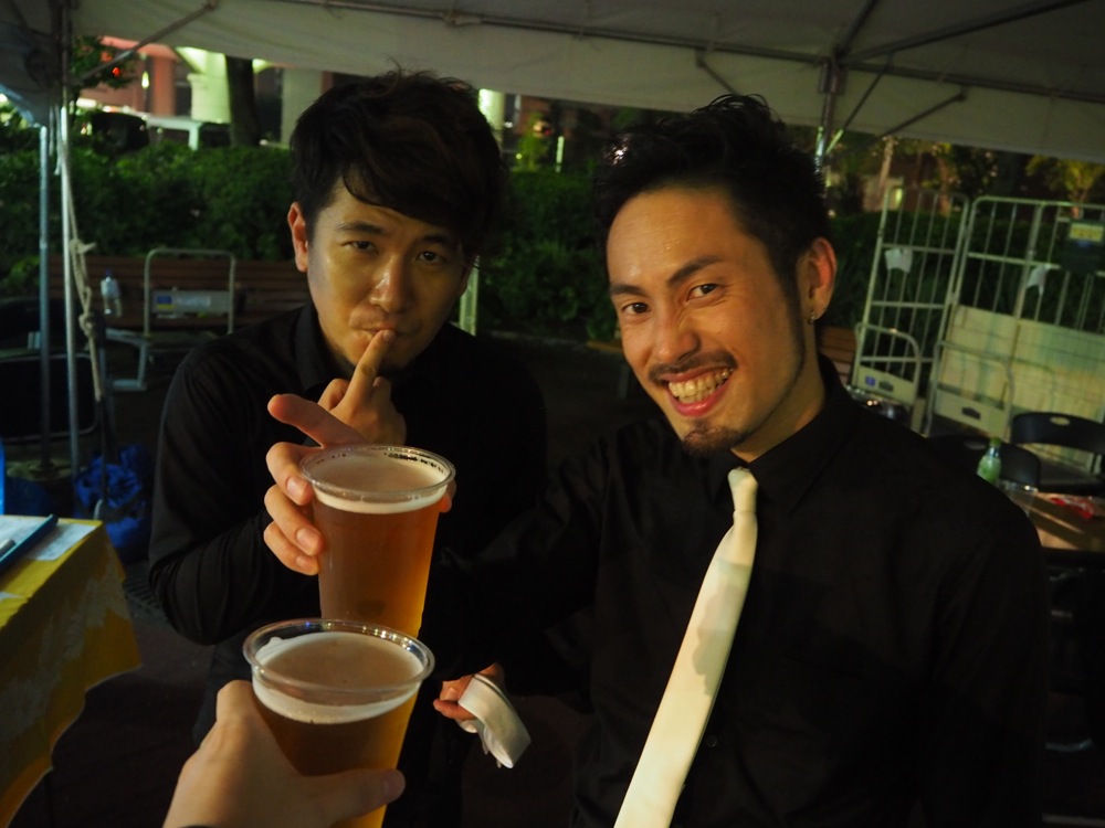 会場に着いた時には既に日が暮れており、広場には椅子とテーブルが並んで、ビアガーデンのような雰囲気になっていました。この日はとても蒸し暑く、夜になってもその暑さは続いたままになっていまして、この広場も風通しがあまり良くなく、かなりの湿度が溜まっている感じではありましたが、ここで熱いライブをお届けするというのは、一種の挑戦のようでもありました。メンバー一同、改めて気合いを入れて取り掛かります。