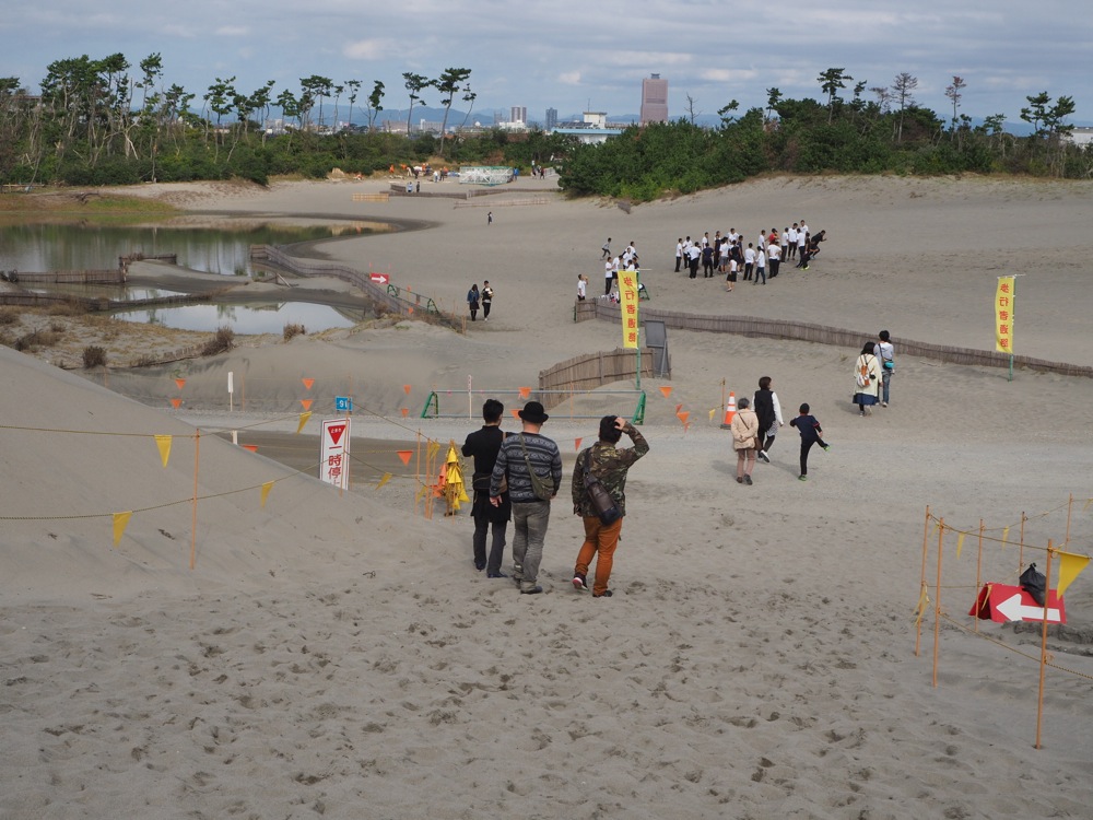 現地には12:00くらいを目指して向かった TRI4TH でしたが、この日は首都高の交通規制が行われるかもしれない…という状況を踏まえつつ、朝7:00に東京を出発させました。しかし、結局はこの時に規制は何も行われず、順調にも10:00には現地に着いてしまう事が分かり、何か時間を潰せる現地ならではのスポットはないか…という話しになり、候補に出てきた場所が日本三大砂丘の1つ、中田島砂丘でした。自分はあまり存在を知らなかったのですが、日本最大の砂丘、鳥取砂丘が地元という藤田氏がメンバーにいる TRI4TH。これは立ち寄っても良い場所ではないでしょうか。