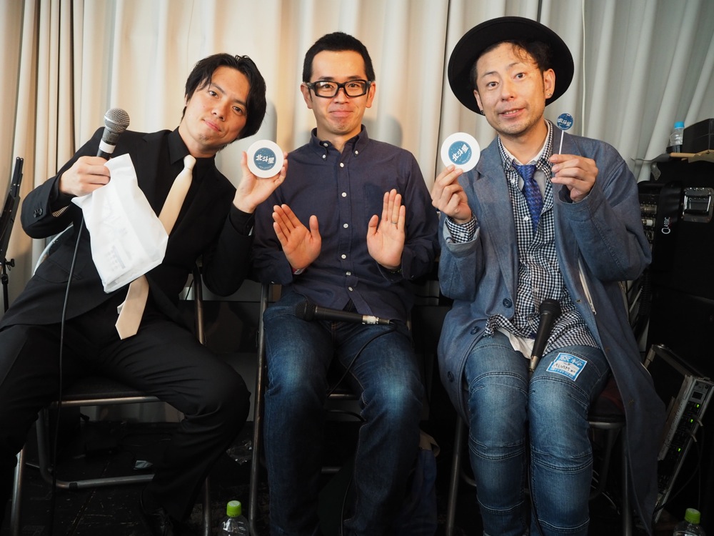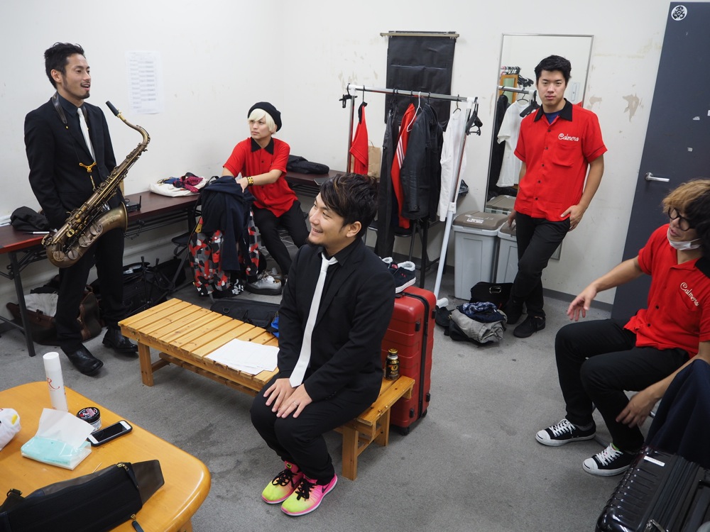 さて、お腹も満足したところで窓枠入りを果たしました。イベントとのメインアクトとなっている ADAM at の玉田さん、そしてひと足早く出番を終えたカルメラとも顔を合わせて、ここは一体どこなんだろうと、何だかよく分からなくなりますが(笑)、自分達の出番は刻一刻と近付いていました。1日に同じステージに約10バンドが出演するという状況は、時間を押してしまうのは御法度を意味しているのです!