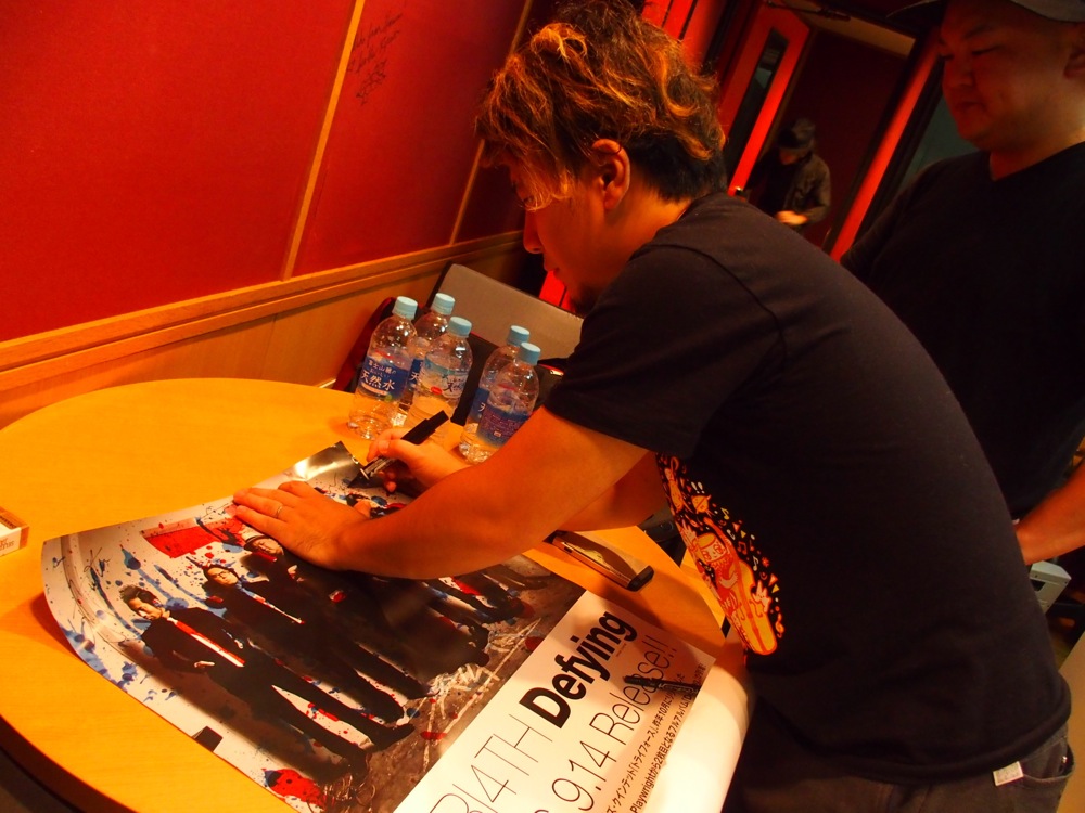 収録も、正に通常のライブをやっているように…との事でしたので、本当にここで今ライブを行っているような、そんなテンションでやらせて頂きました。演奏自体は短い時間ではありましたが、TRI4TH らしい熱量のある音の渦を凝縮してお届け出来たのではないかと思います。演奏後には今録音した音を早速チェック。特に問題も無く、オッケーも出て終了となりました。今回のような経験は今まで無かったので、始めから終わりに至るまで、新鮮且つ、楽しい時間を送る事が出来たと思います。最後にはポスターにサインも書かせて頂きました。多くの方に聴いて貰えるようにと願いつつ、FM802 を後にしました。