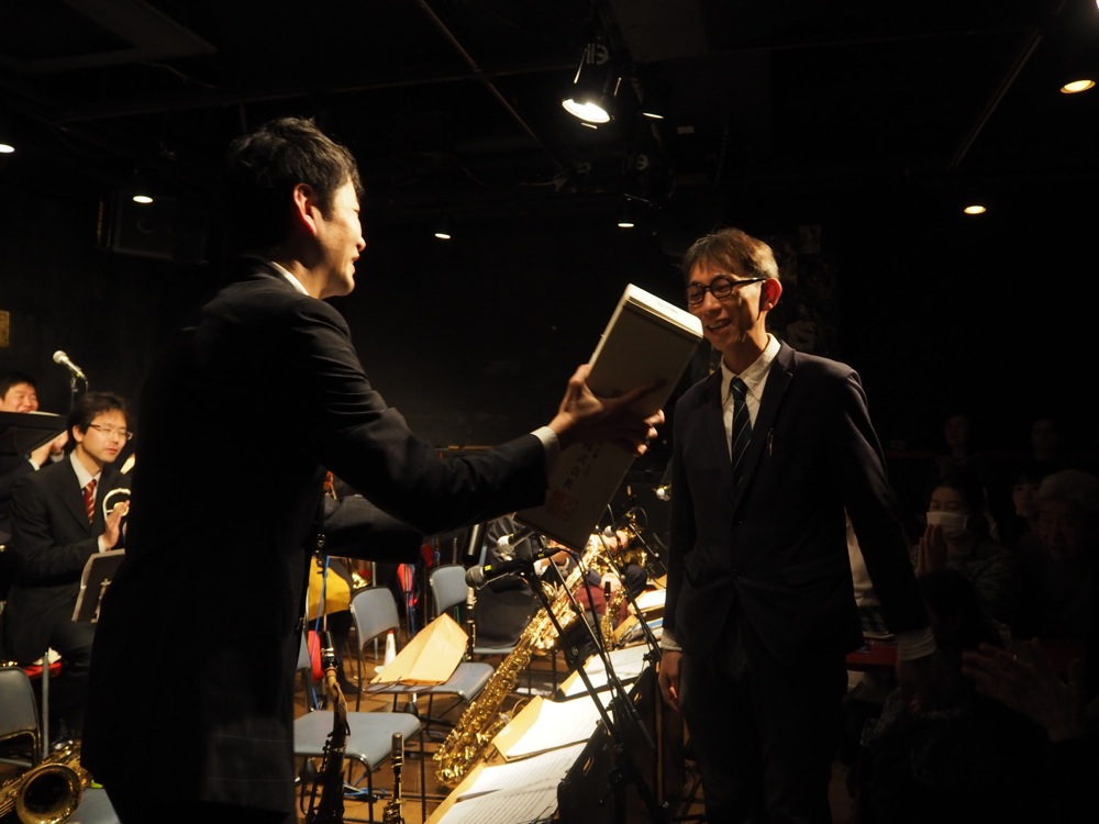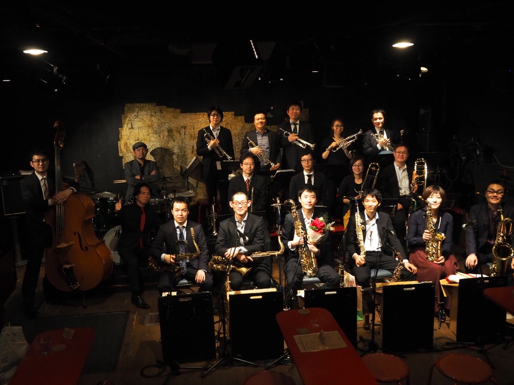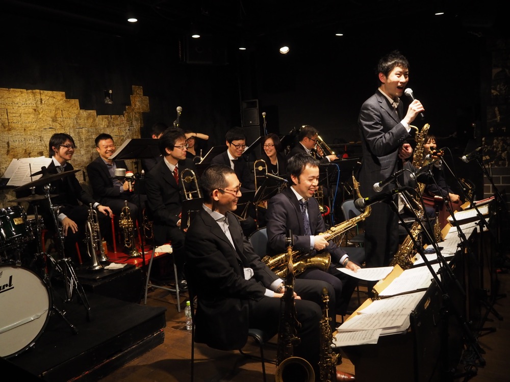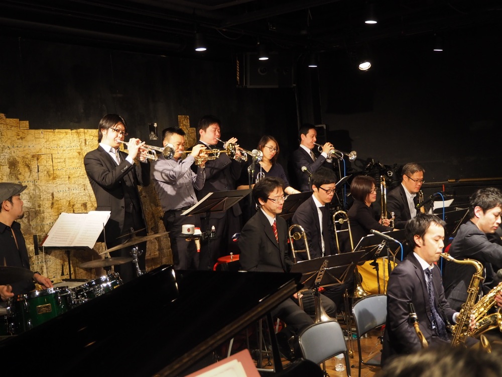 Hard Floods のリーダーの早川智人さんも、今回、色々な面で気を遣ってたので、本当にお疲れ様だと思いますが、よくぞこの18人のバンドを引っ張ってこれたなと思います。このバンドに限らないですが、ビックバンドはとにかく人数構成が多いので、リハーサルをしても全員が揃うという事はまずなく、しかもこのバンドのメンバーは、既に何人かは地方に行ってしまっているという状況でもあるので、尚更揃う事は難しいでしょう。そんな中で実現したライブというのは本当に凄い事で、まずはそこは評価すべきところでしょう。そして事前のリハーサルでは、本当にこれで本番を迎えられるのか…という状況も多々ありましたが(笑)、やはり本番の演奏が一番良かったですし、音もガンガンに出ていました。今では楽器を弾く機会も減ったというメンバーも多い中、かつては大学のビックバンド部に所属して、練習も相当やっていたというのが生きている気もしました。