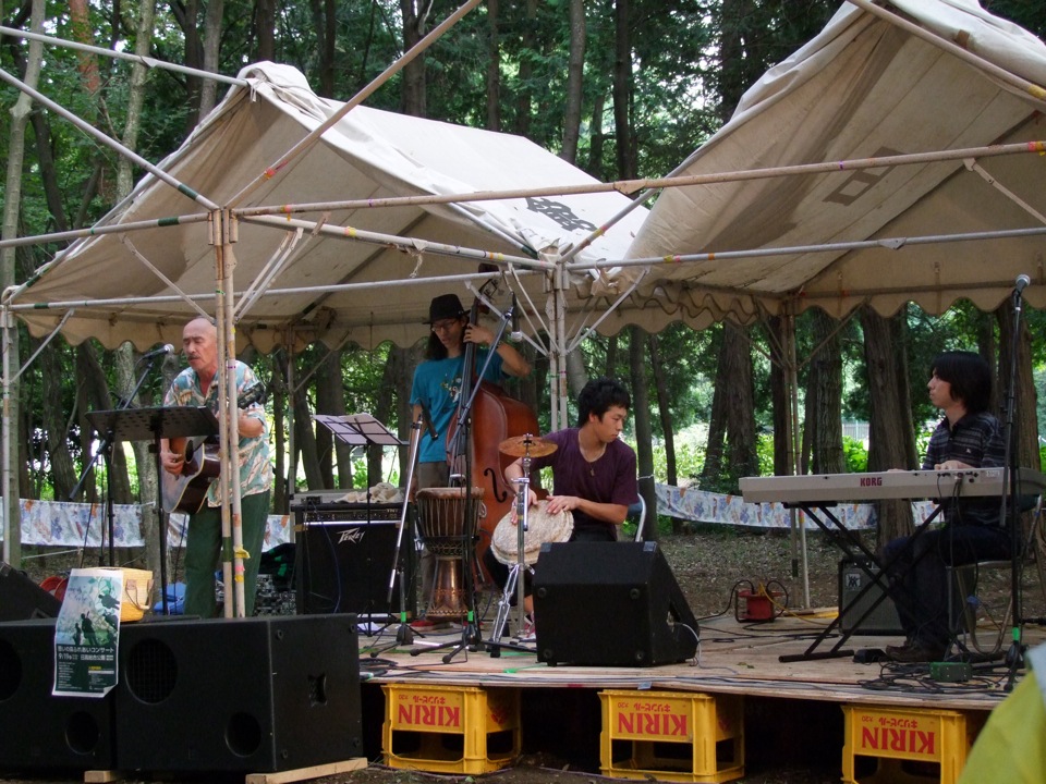 この日は、自分達を含めて計10組のミュージシャンが出演していましたが、Daddy 津田さんや水野たかしさん等、お馴染みの方達が勢揃いといった感じで、流石、さばいばるいとうさんの企画のライブだ!と思ってしまいますね(笑)。その他にも、今年の7月に修善寺で演奏した時〔“Folk Song Festival 伊豆”に参加 参照〕にお世話になった、修善寺 Cafe de Schile(かふぇ・ど・しーれ)のマスター、Donya さんや、8月中のツアーで、山口での演奏時にお世話になった李陽雨(イ・ヤンウ)さん等も出演しているようで、今まで伊藤さんと回ってきた土地土地で出会った方々が、今日、一同に介している…という雰囲気で溢れ返っていました。これぞ伊藤さんの人徳ですよね。確かに、人と人との縁で深く成り立っているイベントであるという事が、改めて感じられました。