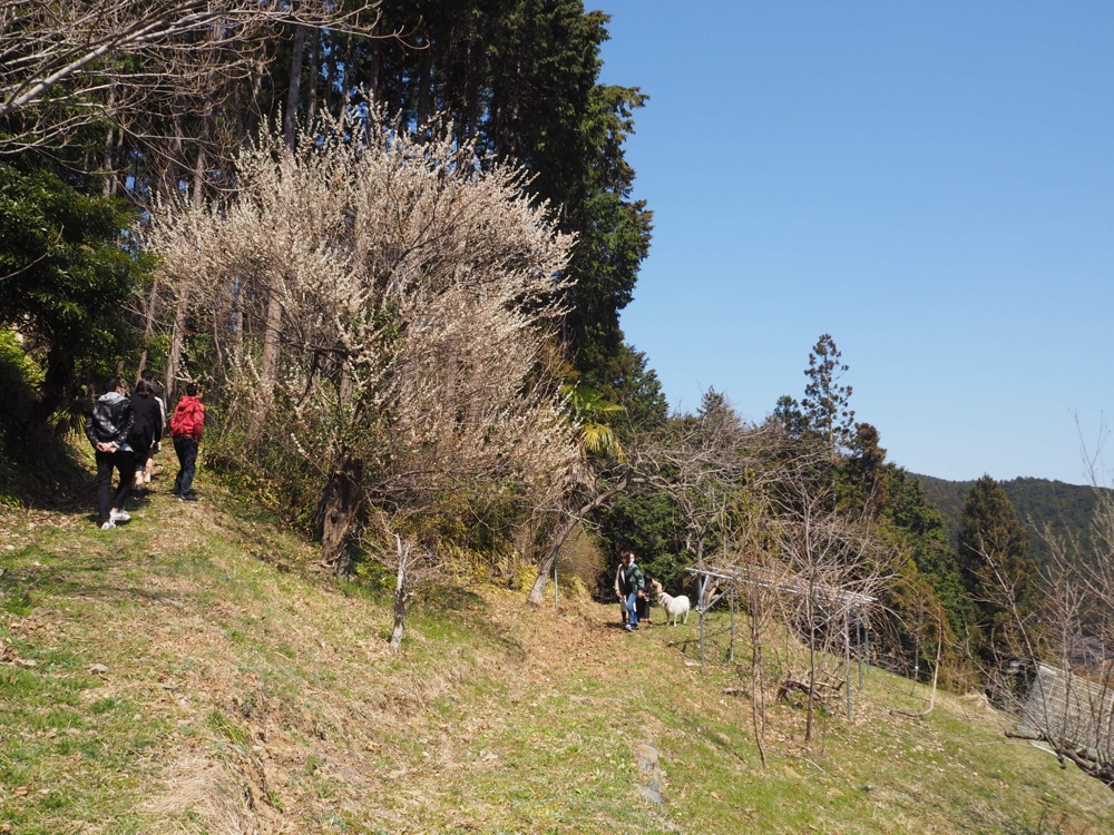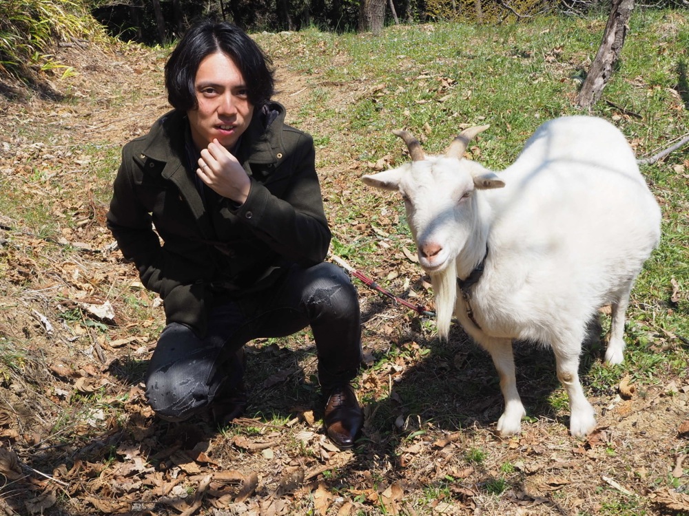 山間部とは言え、ときがわ町は既に春の陽気に包まれていました。コートを着ていったのが後悔しそうなくらい暖かかったその日は、4日前に都内にも降った雪が嘘のような状況でもありました。まず集合したのは依頼人所有の古民家で、ここでランチをしながらジャズセッションが行われるとの事…。見た目には2階建てでしたが、その1階部分はとても広く、30名以上は収容出来そうな感じでしょうか。ストーブがまだ焚かれていたのが山間部を思わせましたが、そしてその部屋の奥にドラムセットやアンプ、そしてキーボード等が置いてあり、確かに、すぐにでもセッションが出来そうな状況ではありました。自分は早めに到着したのか、後から続々と沢山のお客さんが到着してきます。…セッションタイムとは言え、ランチと同時進行の時間でもあり、皆の行動もわりと自由気ままな感じではありました。中には、古民家の近くの高台の上にある建物に、出来上がったばかりのパンを取りに行くというミッション?も組み込まれ、皆、思い思いの時間を過ごしていきます。せっかくなので、自分も山羊と記念写真を撮りました(笑)。