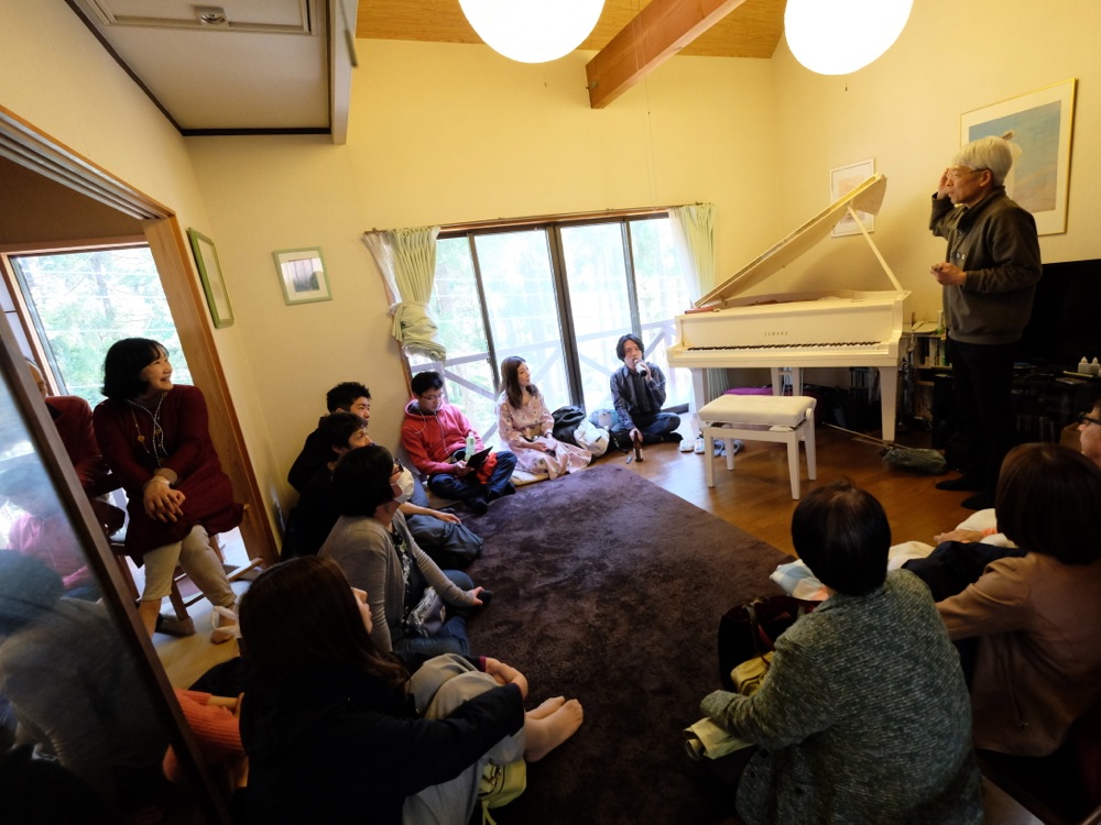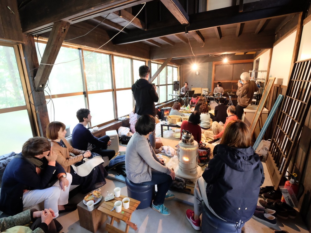 先程のパンもそうでしたが、古民家では取れ立ての野菜サラダや鹿汁(!)等も振る舞われており、自分もビールを頂いたせいか、いきなりお腹が満腹状態になってしまいました。周りの方とご飯を注ぎ合ったりして、自然とコミュニケーションもとっていくような時間です。そんな時にセッションも既に始まっていましたが、せっかくなので自分も1曲参加。今回のコミュニティを通じて出会った方々と“All The Things You Are”(依頼者のリクエスト曲でもありました)を演奏させて頂きました。この後はソロライブが控えていますが、自己紹介も兼ねて丁度良い機会になったかもしれませんね。
