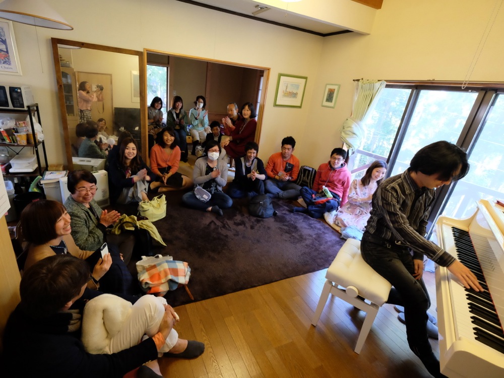 さて、少々盛り上がってしまったので、時間が押し押しになってしまっているようです。ここで移動を開始、今度は依頼人の御自宅に車で向かうとの事でした。ただの御自宅と侮るなかれ、ここには真っ白のグランドピアノがあり、リビングルームは開放的で、ミニコンサートくらいは容易に行えるような場所なのでした。車で10分くらい掛かるとの事で、30名程の移動は大変だと思うのですが、ここは車組が手分けして送迎…。中にはお客さん同士で相乗りも盛んに行われていて、良い風景だなと思ったりしました。