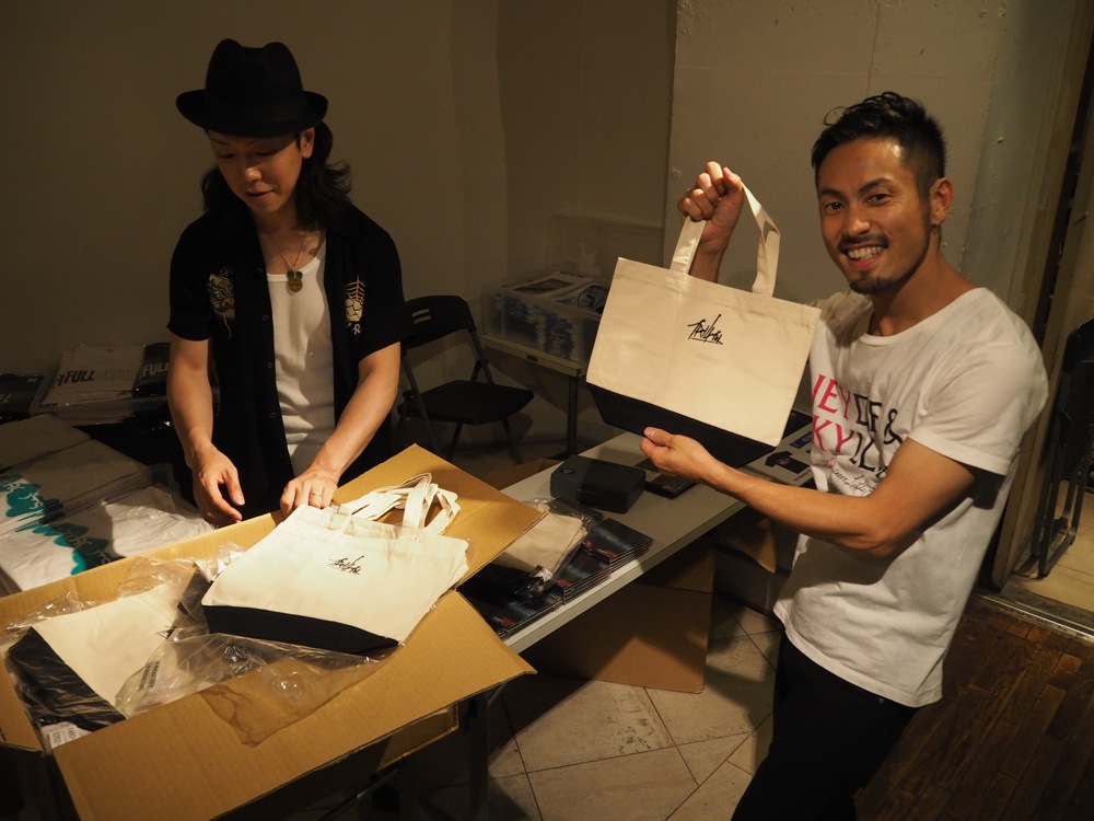 当日は、かなり余裕を持ってお店に入りました。その後、サウンドチェックをするのはいつもの事ですが、久し振りに使用する TRI4TH フラグ、そして照明や進行の打ち合わせ等、そもそもサウンドチェック前にやる事も多いのです。TRI4TH でワンマンライブというと、昨年の12月に行われた〔TRI4TH、クリスマスの 360° LIVE参照〕以来、約半年振りというタイミングにもなっていたので、入念に準備を行いたいのは当然の事でもありましたが、それよりも、以前より更に仕込みを完璧にすべく、だからこそ時間をかけて行っていた…という部分が大きかったのでした。また、お店の方や当日のスタッフの方も含め、自分達のライブに関わる方々も多くなってきています。時間がかかるのは当然の事で、また、多くの方とこれからライブを一緒に作っていくべく、チームとなって進めていくという認識がより強く感じられた時間でもありました。この日から販売される新しいグッズの確認も勿論しておきます!