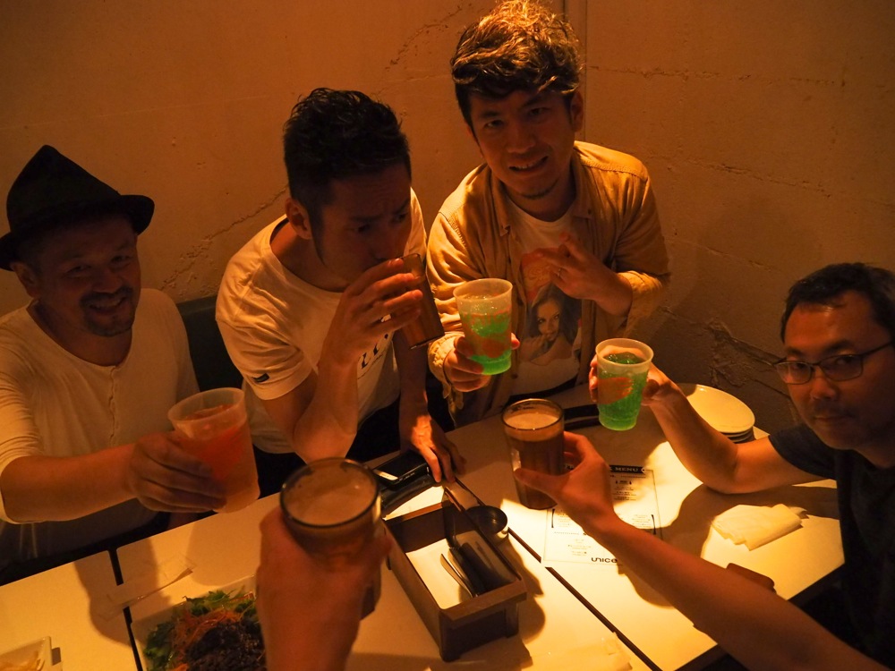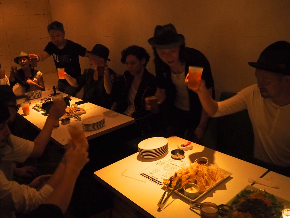 リリース・パーティーを終えた後の打ち上げ会場にて…。初日を無事に終えられたからこそ、皆で囲んで飲むお酒は美味しいものです。今回も多くの方にお世話になりました。どうもありがとうございました!