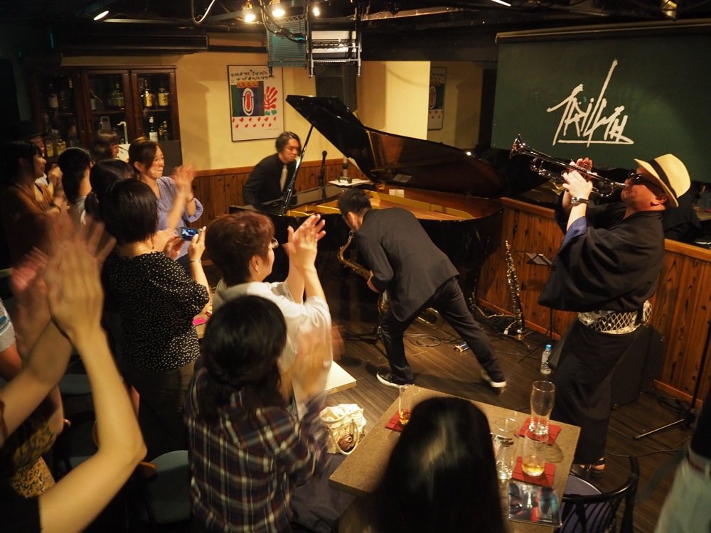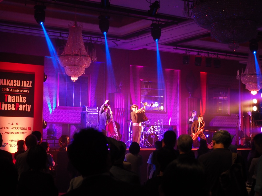 9月12日福岡入りし、翌日13日は、開催10周年を迎えた福岡は中州ジャズの、前夜祭のようなパーティー内での演奏があり、TRI4TH はそのオープニング・ステージを務めさせて頂きました。グランドハイアット福岡で行われたそのステージは非常に豪華な造りで、沢山の関係者の中でしっかりとその役割を果たしてこれたと思います。このパーティーのメインアクトが日野皓正クインテットで、懇親会では日野皓正さんと TRI4TH メンバーとで記念写真も撮らせて頂きました。最最高な写真、どうもありがとうございました!