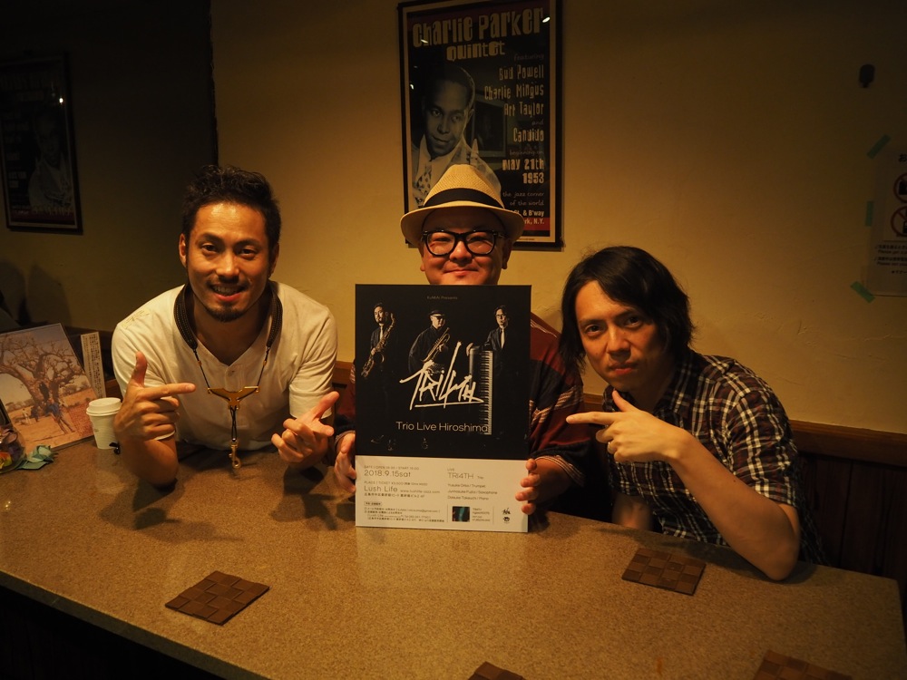 この次の日は広島に移動しましたが、ここでステージを行ったのが、織田、藤田、そして自分という3人での珍しいライブでした。TRI4TH Trio と名付けられたこのトリオは、今まで営業的な感じで演奏をした事はあったものの、きちんと自ら企画してライブを行うのは初めてで、それが TRI4TH にとっても縁の深い広島という地で実現したのは何かの縁だったのかもしれません。ベースレス、ドラムレスという編成は、何やら静かな曲をやるようなイメージがありましたが、実際はその逆で、ガンガンに激しい曲も挑戦していきました。むしろ、ピアノはベースとドラムの分も頑張らなければいけない状況だったので、いつもより大変だったかもしれません(笑)。…とは言え、遣り甲斐のあるライブでした。どうもありがとうございました!