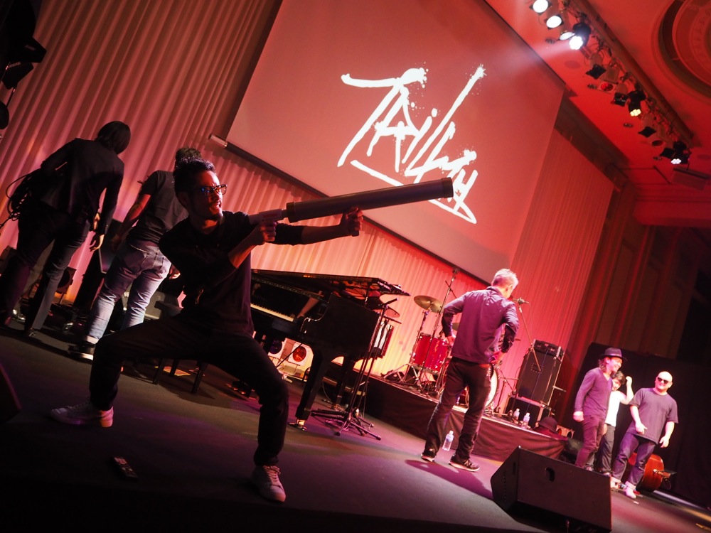 しかし、ここは百戦錬磨?の自分達です(笑)。オープニングアクトの Eiko + Eriko さんのステージを見届け、TRI4TH のステージは23:30からスタート。これまで色々な場所で演奏されてきた経験を生かし、まずは予定された5曲を23:59+10秒ぐらいまでにやり終えました。とても素晴らしい時間配分で、勿論これは、途中途中の演奏で調整もしているからこそ実現出来た事でもありました。当然、ステージの流れも大切にしつつの判断です。そしてリーダータカオさんのカウントダウンと共に、、、