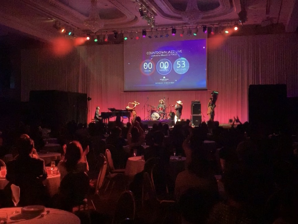 Billboard Live に、GRAND NIKKO TOKYO DAIBA、そしてここに TRI4TH の文字!…何とも嬉しい衝立を作成して頂いたものですが、演奏会場も広く、大きなステージの背後には、これまた大きなスクリーンも用意されていて、自分達の映像も映れば、TRI4TH ロゴも表示されるという、至れり尽くせりの環境を用意して頂いていました。これは自分達の演奏も気合いが入るというものですが、カウントダウンという大役に、若干のプレッシャーも感じてもいたものです。