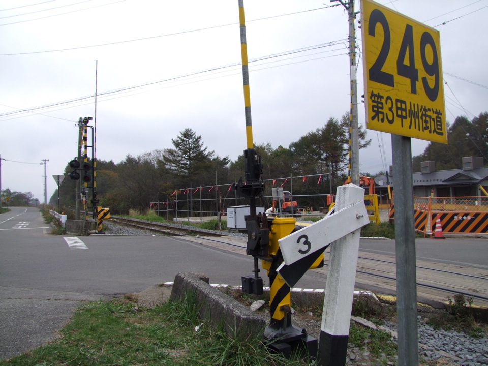右上の写真の白色の標識が、JR鉄道最高地点を表すものです。ここにある踏切の、清里方向の線路脇に建てられています。この標識は、いわゆる勾配を示すもので、数字の“3”というのは千分率の値、つまり1000m進んで、3m高さが変わる勾配(‰…パーミルと読みます)を表しています。この標識は、どの鉄道路線にも建てられており、線路の勾配が変わる度に置かれている標識でもあるのです。