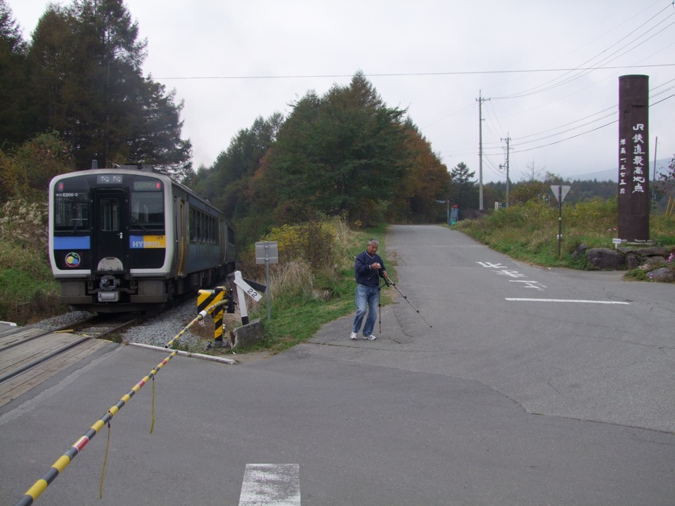 やがて清里駅を抜けて暫くすると、明らかに峠を越えたような感じになる場所がありますが、そこが正にJR鉄道最高地点で、標高は1375mです。ここから急に開けて、列車の左手には八ヶ岳の全容が望める筈なのですが、やはりこの日は曇が多くて無理でした。山の裾野くらいは辛うじて分かるくらいだったのですが…。