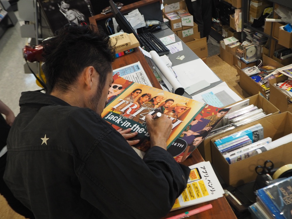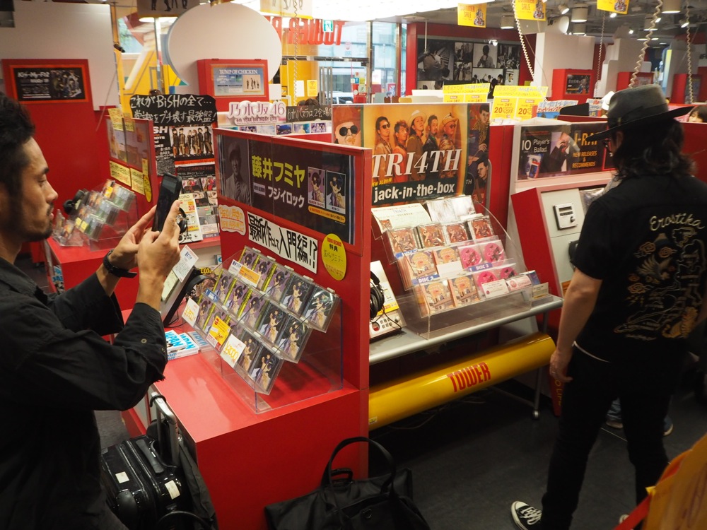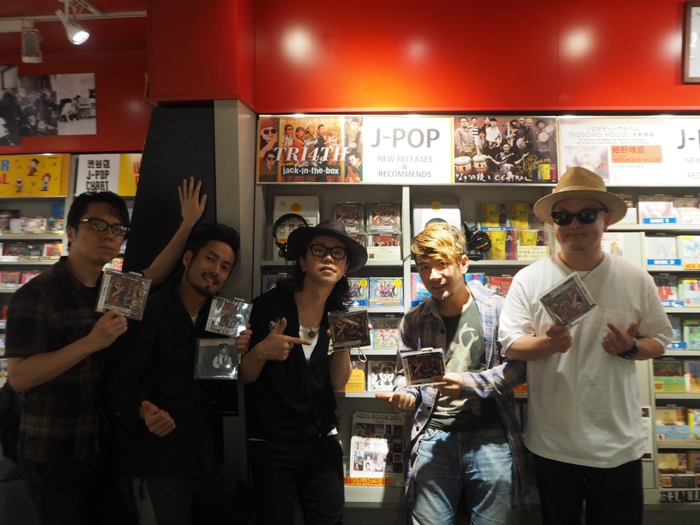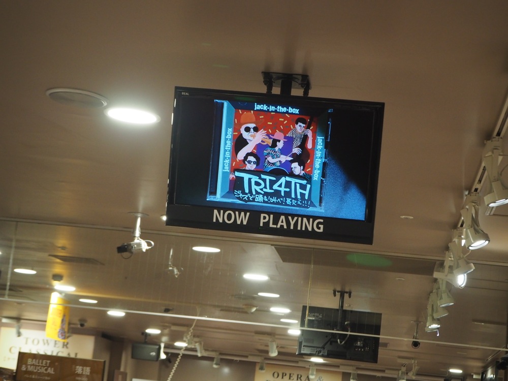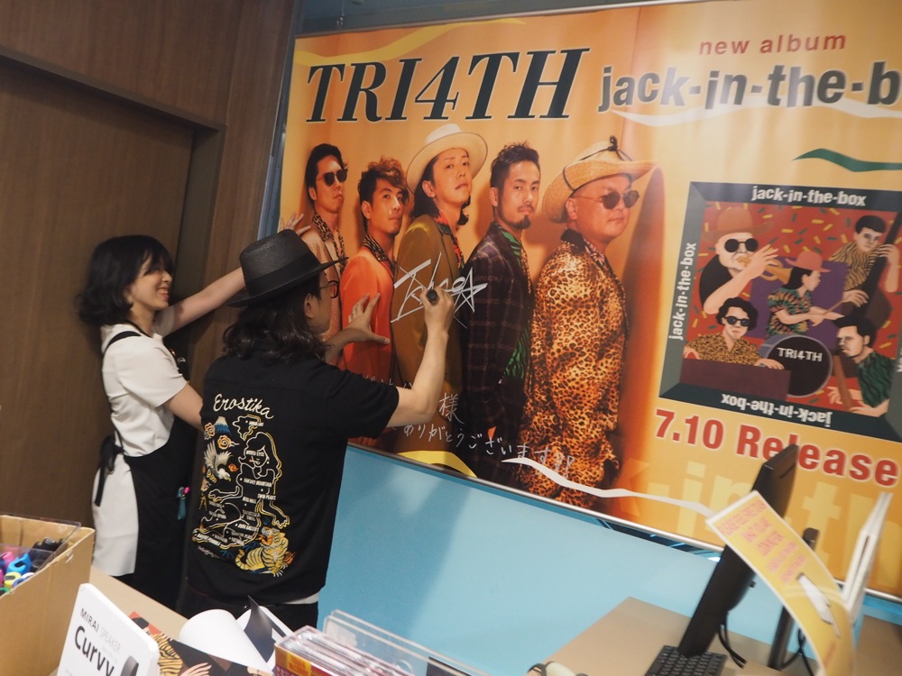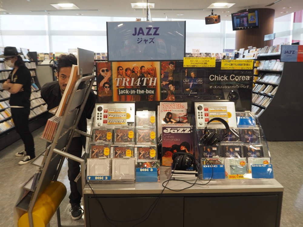 7階にも勿論 TRI4TH 棚は置いてあり、その後には3階へと案内されました。渋谷店の3階はロックやポップスのフロアなのですが、なんと今回はこのフロアにもCDを置いて下さっているとの事です。実際に向かってみると「J-POP」と書かれた棚に置いてあり、これには自分達も驚きましたが、ふだんジャズをあまり聴かない人でも自然に聴けるような作品を目指したところもあるので、この展開は嬉しかったです。