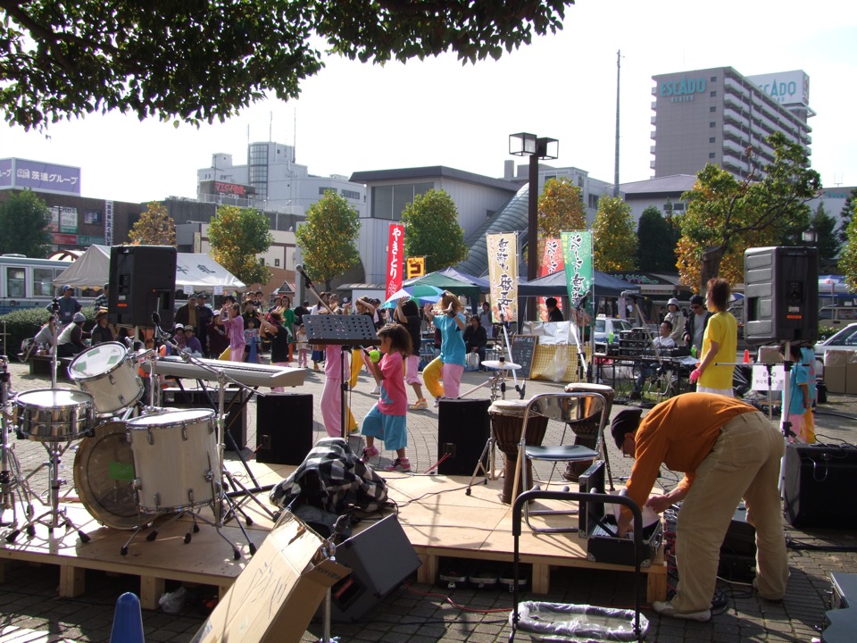 場所は、本当に牛久駅の目の前という感じです。要は、駅前のロータリーの中に会場を用意している状況だったのに、正にタイトル通りの場所という事ですね。ステージの他に、色々な屋台も並んでおり、小規模ながら、和気藹々としている雰囲気が印象的でした。出演する人というのも、自分達のようなライブ的なものだけではなく、ダンサーもいたり、大道芸の人もいたりと、なかなかバラエティにも富んでいて、多角的な戦略を感じさせてくれたものです。