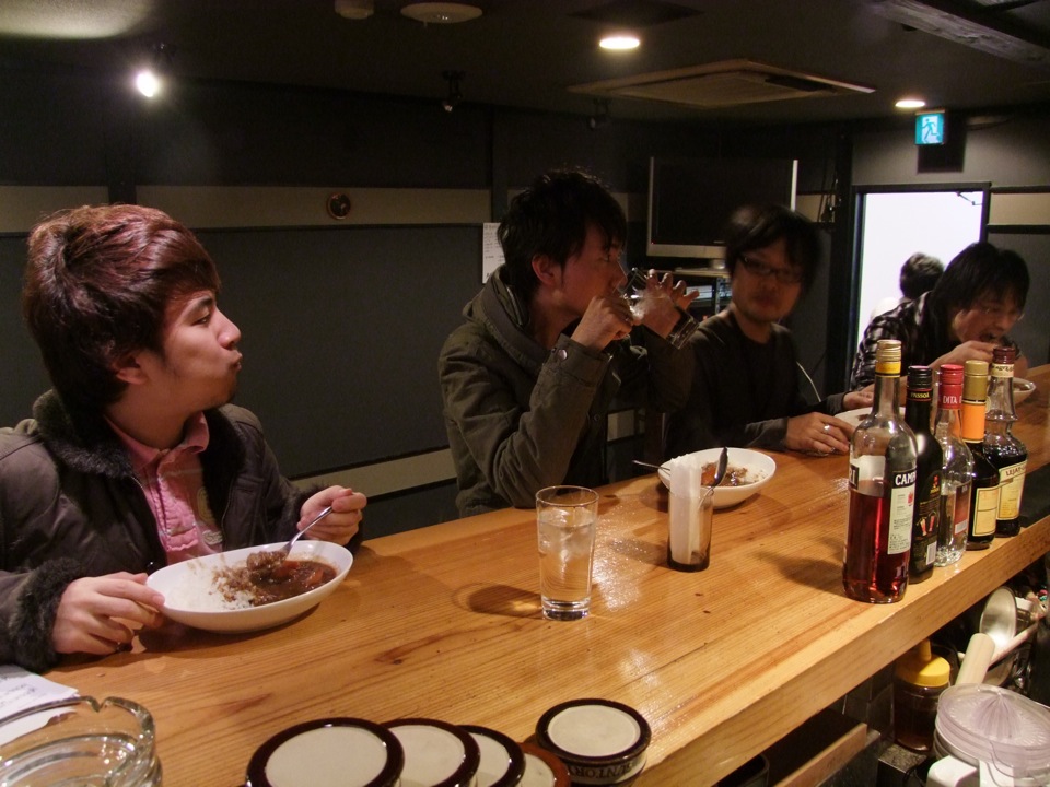 いつもはライブをやっていないスペースですが、この時ばかりは椅子やテーブルを全て外し、店内をオールスタンディング状態とさせます。そして、普段なら20人くらい人が入れば一杯の空間に、50人ものお客さんを押し込んでライブをやっていくのです。この光景も、もう自分は見慣れている筈なので、今更驚いている場合ではないのですが、やはり毎年、実際にそういった光景を目の前にして演奏していると、相当クレイジーな空間だと思ってしまうのです(演奏している自分達が、よっぽどクレイジーですが…笑)。