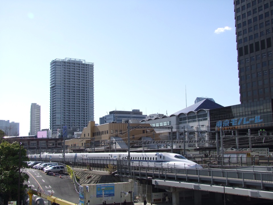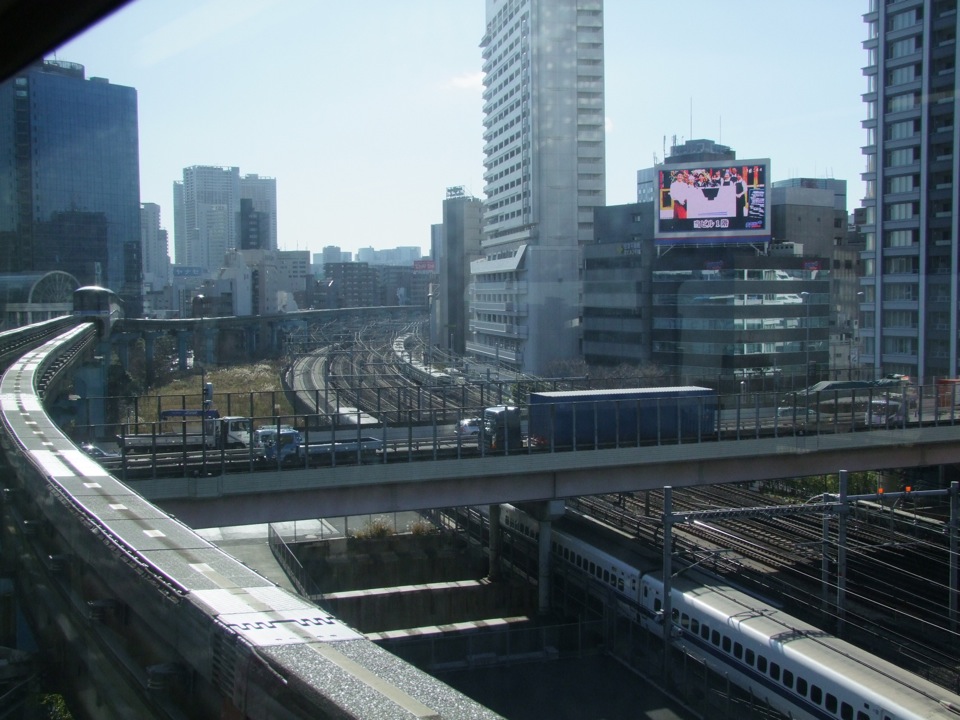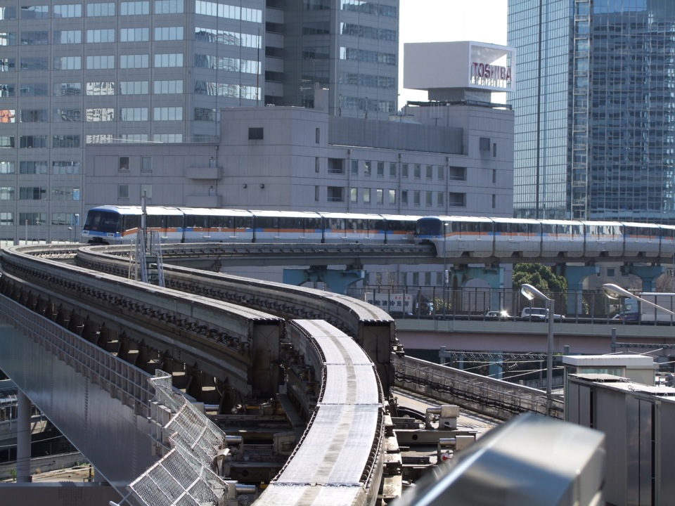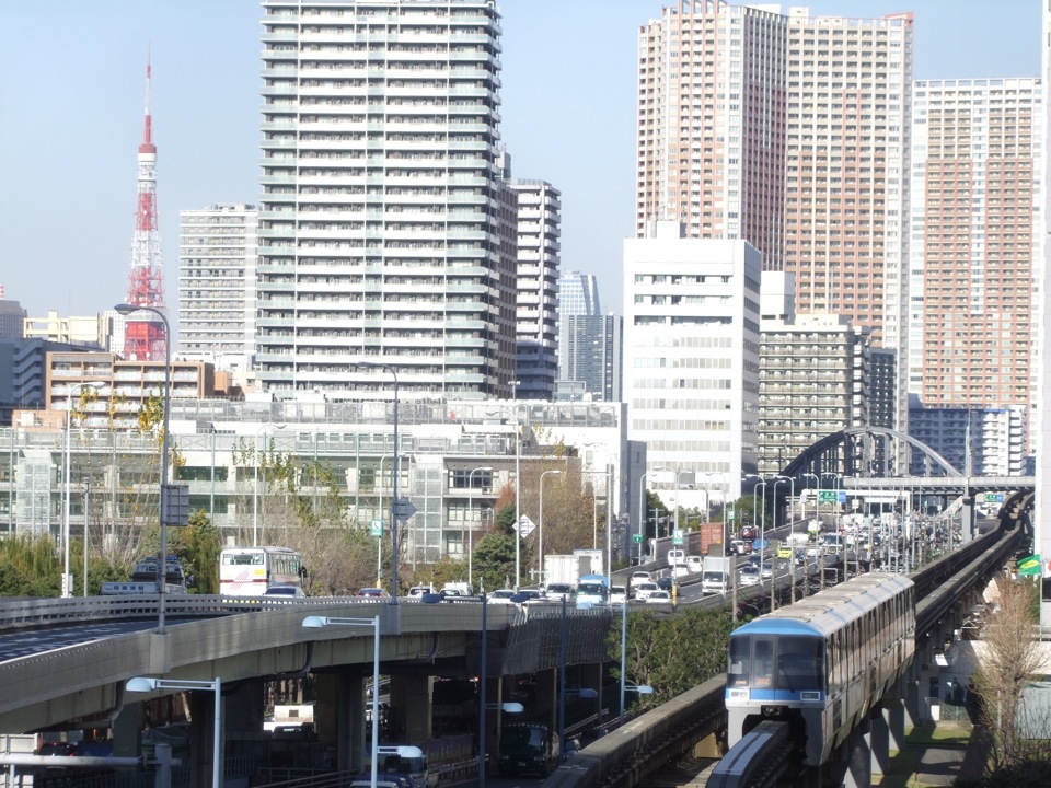 さて、浜松町駅を出ると、眼下に東海道新幹線を含めたJR線を乗り越し、暫くは寄り添うようにして進んでいきます。東京モノレールのダイヤはタイトなので、駅を出てすぐに、新たに浜松町駅に到着する列車と擦れ違う事でしょう。もうすぐJRの田町駅という辺りで、JR線とは分かれ、今度は芝浦の辺りを進んでいきますが、この付近には駅は設けられていません。ただ、オフィスビルや運河の上空を、滑るように走行していく様は、乗っていてもスリル感があって面白く、ある意味で東京モノレールらしい光景が望める区間だなとも思っています。