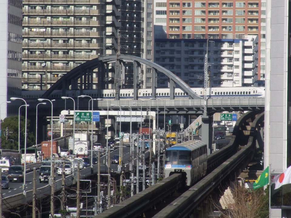 カーブや高低差も乗り越え、大井車両基地に出入りする東海道新幹線と交差(左上写真参照)すると、そろそろ天王洲アイル駅になります。この駅は1992年に開業したので、この路線の中では新しい方の駅ですが、当時は倉庫が乱立するような場所だったそうで、今や臨海高速鉄道りんかい線も乗り入れている等、その変貌には驚かされるばかりです。駅の羽田空港寄りには、前述の新幹線の線路も見え、左下写真のように、一緒に写真に収める事も可能です(笑)。