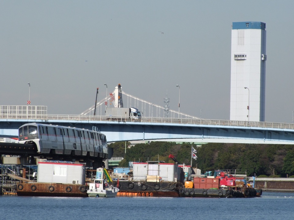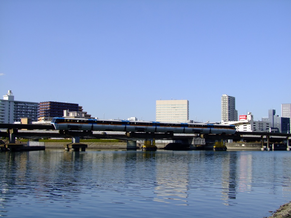 さて、右手に見える高速道路は混んでいる事が多いので、ここは東京モノレールの速さを実感する区間かもしれません。今ではモノレールは、重要な交通手段になっているという事の証でもあります。また、左手の運河より向こうの土地は全て埋立地となっていますが、そちらにも多くの団地が建ち並び、近代的な風景を作り出しているかのようでした…。ただ、全体的な風景は、ここ20年でそんなに変わっておらず、そもそもモノレールというものが、近代的な建築物なのだという事なのでしょうね。運河は意外と綺麗で、釣りをしている人もいるくらいでした。