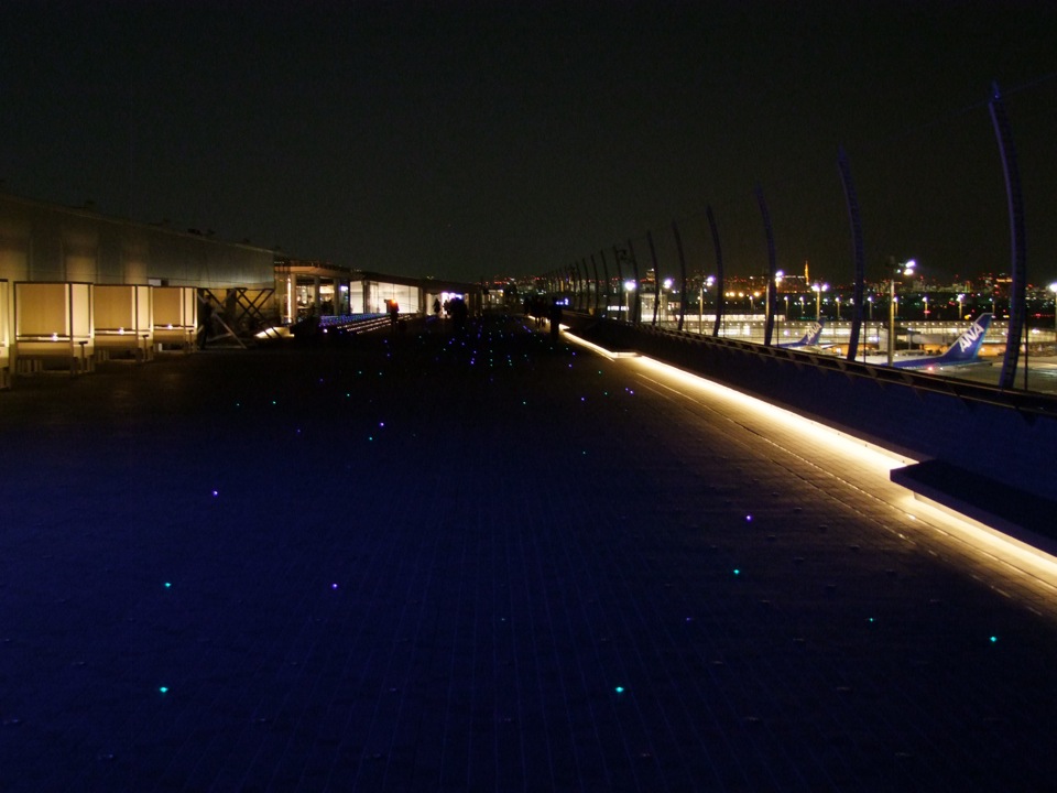 実は、羽田空港の国際線ターミナル開業で、陰に隠れがちなのですが、このターミナル2の方でも最近、建物の拡張が行われおり、色々なお店も新たにオープンしているのです。まだまだ空いているせいか、雰囲気的にも良い感じです。特に、展望デッキはわざと照明を落としてあり、更には夜の滑走路をイメージしたような光の使われ方がされており(右下写真参照)、なかなか興味深い事になっていました。