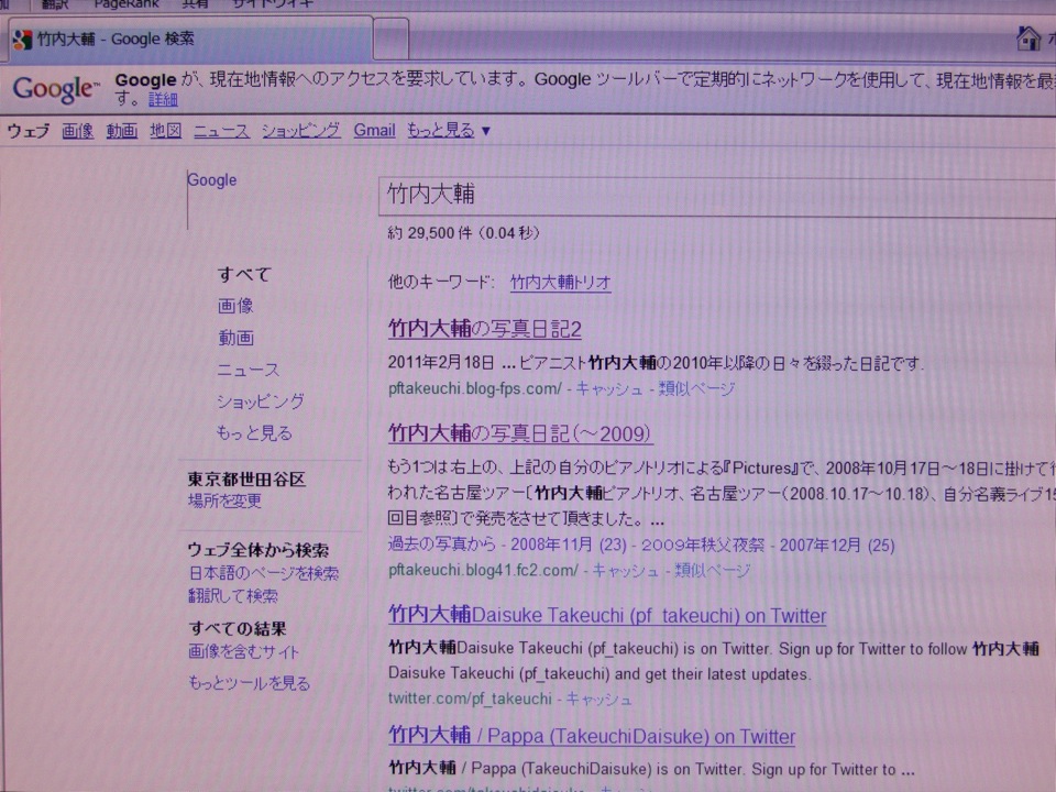 過去のブログ〔竹内大輔の写真日記(~2009)〕を押しのけ、現在のブログのリンク先が一番上に表示されています。検索ヒットの順序というのは、閲覧者数の多い順に表示されているのだと思いますが、このブログを始めて暫くは、やはり以前のブログが一番上に表示されていた状態だったのです。これは仕方の無い事で、今まで見て頂いた方の多かった方が、新しく始めたものよりも多くなるのは当たり前です。しかし一番上に表示されるが故、まずはそちらのページから見てしまう方も多い筈なので、なかなか現在のブログが以前のブログを超える事は無かったわけなのです。