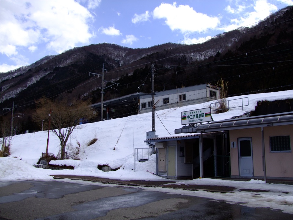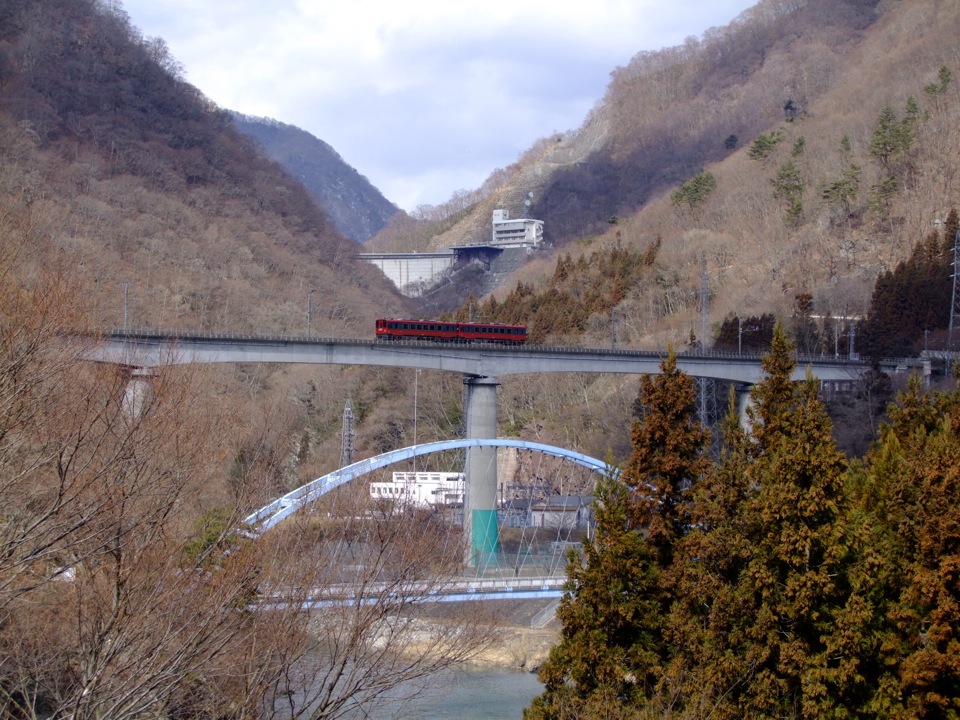 湯西川温泉駅から、次の中三依温泉駅までは駅間が長く、6,5kmもあります。この区間は目立った平地も無いので、トンネルの連続という感じで、一気に山間部を抜けてしまう感じなのですが、実は以前、自分はこの駅間を歩いた事があったのです(しかも、今くらいの冬の時期にです…笑)。当時は、左上写真の鉄道橋の奥に見える道路橋が出来ていなかったので更に大回りになっていて、実質8~9kmくらいは歩いたような気がするのですが、自分ながらよくやったと思います(笑)。その代わり、大自然の中を強行突破するような?野岩鉄道の列車が見えて、改めて凄い路線だなと思った記憶がありますね。この間、列車ですと7分くらい到達するので、鉄道の便利さと言うか、この路線が東京(浅草)まで繋がっているという安心感と言うか、何か偉大なものを感じた時期でもありました。