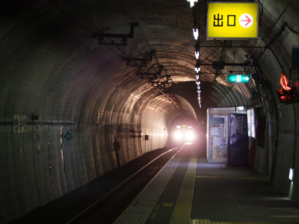 さて、川治湯元駅を出ると、これまた長いトンネルに入ります。沿線で最長の葛老山トンネルというもので、その延長距離は4250mもあるのですが、こんこトンネルを出ずして存在するのが、次の湯西川温泉駅です。この駅に降り立つと、すぐ先がトンネルの出口なのは分かるのですが、人間の降りれる出口は勿論別(階段で何段か上がっていきます)で、いわゆるこの駅は、山岳トンネル内にある駅…にあたるわけです。