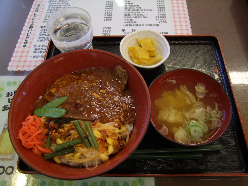 この駅は、道の駅と併設となっており、お土産屋や食堂など、なかなか充実した設備を持っています。しかし、周りに民家等は無く、ここから湯西川温泉街までも、バスで30分くらい掛かります。しかし、列車からバスへの接続はちゃんとしているので、要は中継地のような役割を果たしている駅だという事でしょう。駅の北側には、五十里湖を渡る鉄道橋梁が見え、この日は湖が凍っている姿が目撃出来ました。この季節ですと、この駅から雪が目立ってくるようになってきます。丁度お昼時でしたので、この建物内にあった食堂で、“鹿ビビンバ丼”(右下写真参照)なる物を食べておきました。鹿はどうやらこの辺りでは産物らしいです…。さてさて、この辺りが“さんぽ”の中間地点になるでしょうか…。