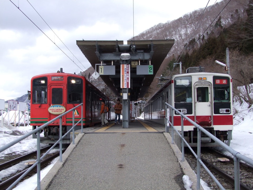 このまま線路は先に延びていますが、ここからは会津鉄道という、やはり第3セクターの鉄道会社となっています。この路線の途中の会津田島駅までは電化されているので、東武鉄道や野岩鉄道からの列車は、その駅まで直通運転されています。その先は非電化区間なので乗り換えは発生するものの、最終的には会津地方の中心地、会津若松駅まで行けるので、都心から会津方面のルートとしても、この鉄道は見逃せない存在となっているのです。逆に、会津鉄道側からの列車(気動車)が、野岩鉄道、そしてその先の東武鉄道鬼怒川温泉駅まで乗り入れているのですが、これが今までに何度か写真に登場してきている“AIZU マウントエクスプレス”という快速列車で、今回はこれで一気に戻る事にしましょう。