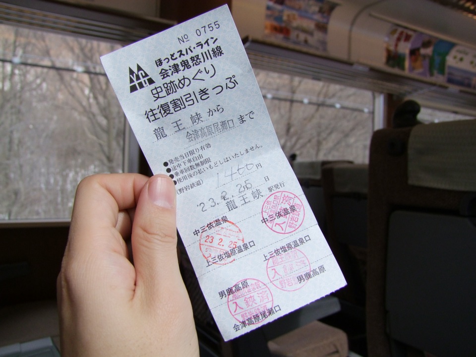 今回の“さんぽ”に使わせて頂いた切符は、史跡めぐり往復割引きっぷ…というもので、料金は1460円でした。龍王峡駅~会津高原尾瀬口駅の片道運賃が1040円なので、これはお得な値段設定と言えるでしょう。これは龍王峡駅、川治温泉駅、川治湯元駅を発駅とした場合のみ発行される切符で、それらの駅から会津高原尾瀬口駅までの区間が乗り降り自由というものです。自分は今回、野岩鉄道自体は龍王峡駅から乗ったので適用となったのでした。ただし、この場合だと、帰りの龍王峡駅~新藤原駅間は別清算しなくてはならないのですが、それでも龍王峡駅~新藤原駅間の料金は190円なので、まだまだお得なのです。ちなみに、野岩鉄道全線のフリーきっぷも存在していて、それは2000円になるのですが、それでも前者の方がお得ですね点。この鉄道には、東武鉄道や会津鉄道も絡めたお得な切符が色々と売られているので、用途に応じた検討をした方が良さそうです。