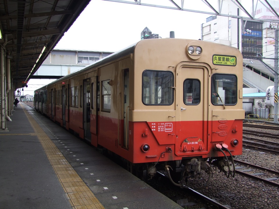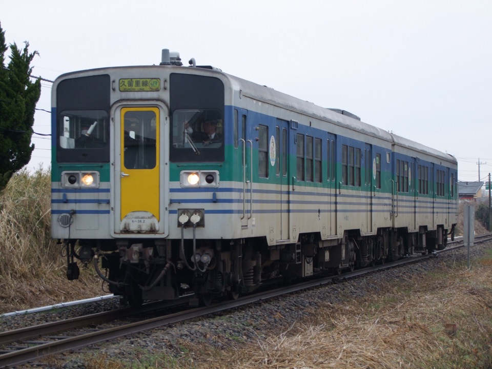 久留里線は全線非電化で、いわゆるディーゼルカーと呼ばれる車両がここでは活躍しているわけですが、そんな特殊な事情から、ここには全国的にも珍しい車両ばかりが集められています。現在、久留里線で走っている車両は全部で3形式、キハ30形、キハ37形、キハ38形です。いずれも、20~40年くらい前は、大都市の非電化区間の通勤型車両として活躍していた車両ですが、路線の電化や、車両そのものが古い事もあって急激に淘汰されてしまい、気付くとここ久留里線に、全てが集結した感じになってしまいました。つまり、全国のJR路線でこれらの車両というのはここ久留里線にしか走っていなく、全てが孤高の存在となっているのです。言わば本当の意味での希少車両と言えるでしょう。しかもローカル線である為、車両の絶対数がそもそも少なく(日中は2両編成とかで走っているので…)、キハ30形が3両、キハ37形が3両、キハ38形が7両と、合計でも13両となっております。このうち、キハ30形(上写真参照)は特に古く、製造されたのも1963年~1966年頃なので、車齢からすると奇跡の現役車両と言えるかもしれません。