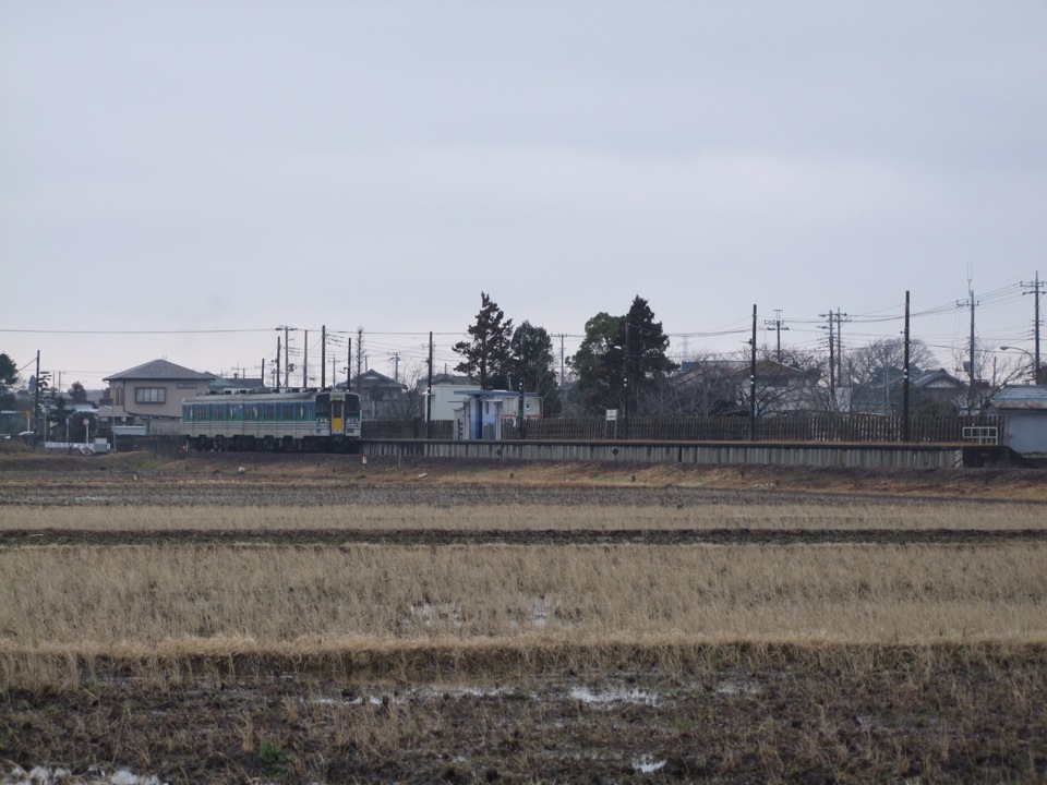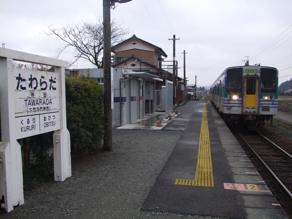 ここで、次の下り列車を待ちます。久留里線は、日中は概ね1~2時間に1本の運転なので、先程東清川駅で列車を見送って以来、まだ次の列車が来ていないのです。一応、横田駅は駅舎があって、建物の中で列車を待つ事が出来るのですが、そこには特にドア的なものがあるわけではなかったので、室内ですら相当寒かったです…。ここで待つ事約15分…。自分以外には1人の学生っぽい乗客を乗せ、更に列車は奥へと進み始めました。