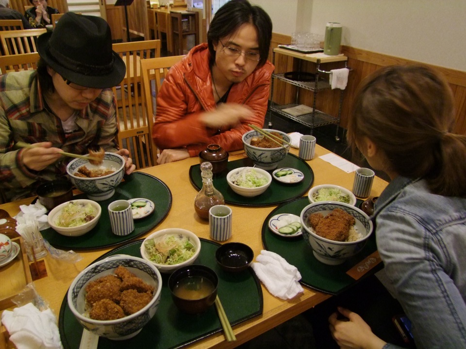 道中はずっと雨で、前述の通り道を間違え、しかも途中で交代した海野さんの運転に皆でビビりつつ…という時間が続いたせいか、お店に着いた時には皆、既に疲れてしまっていた感もありました(笑)。しかし、お店の方に桐生(群馬)名物のソースかつ丼のお店(志多美屋と言い、ソースかつ丼の発祥のお店でもあるとか…)を教えて貰ったので、ここで精神的にも満足感が生まれたのは幸いでした。リハーサル後に腹ごしらえをしつつ(左下写真参照)、いざ本番に立ち向かったものです♪