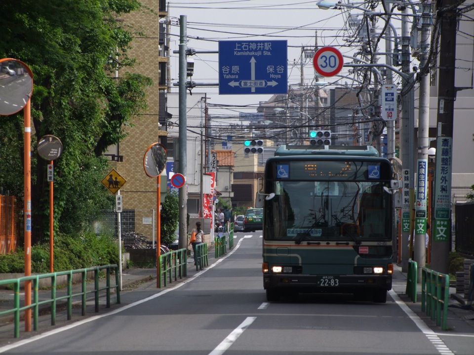 大泉学園駅からの道のりは、西武バスの有数の路線バスが通る道でもあり、バスとの擦れ違いや追い越され等はしょっちゅうでした。途中では、例の吉祥寺駅~成増駅の系統のバスも見る事ができ(左下写真参照)、今更、乗っておけば…と思ってしまいますが、そんな思いも空しく、20分以上は歩いて営業所に到着しました。