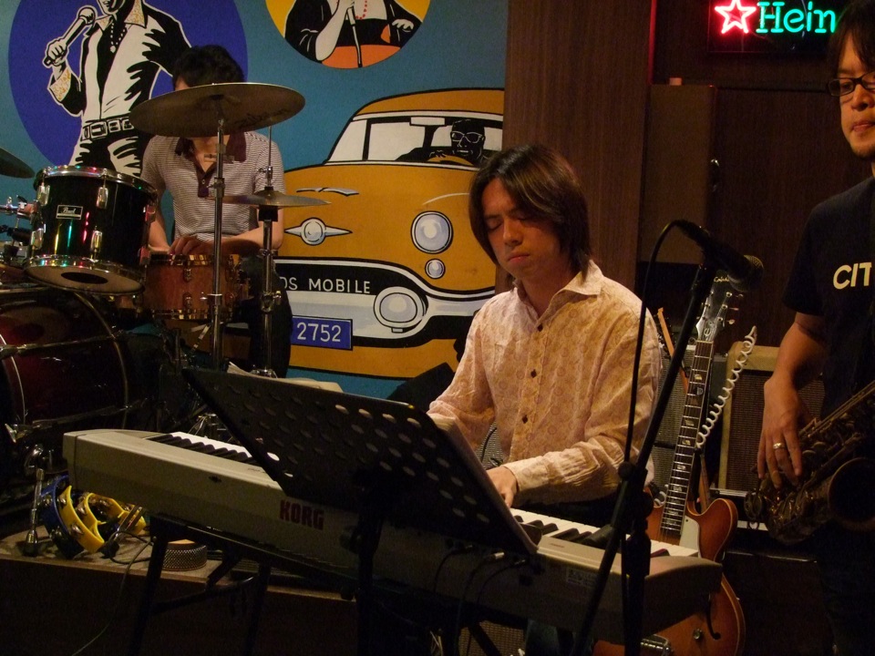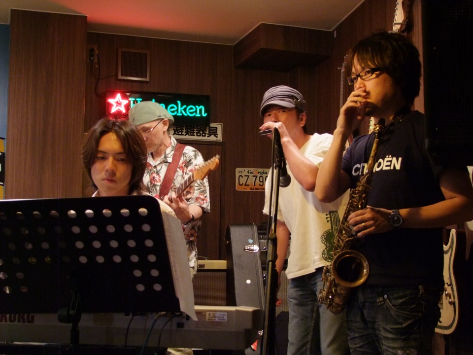 この時のメンバーはというと、ピアノに自分、ベースに池田君、そしてミキヤはジャンベではなくドラムだったのですが、これまた意外にも新鮮な感じではありました。そして、曲によってはアルト・サックスとして、こちらのバンドには初参加の副田君にも加わって頂きました。この後に、ギターやパーカッション、ブルース・ハープ等、何人かの入れ替えはありましたが、基本的には前述した5人で演奏していき、明らかに今までとは違ったサウンドでステージを進めていきました。