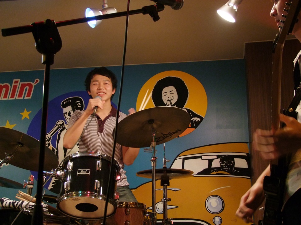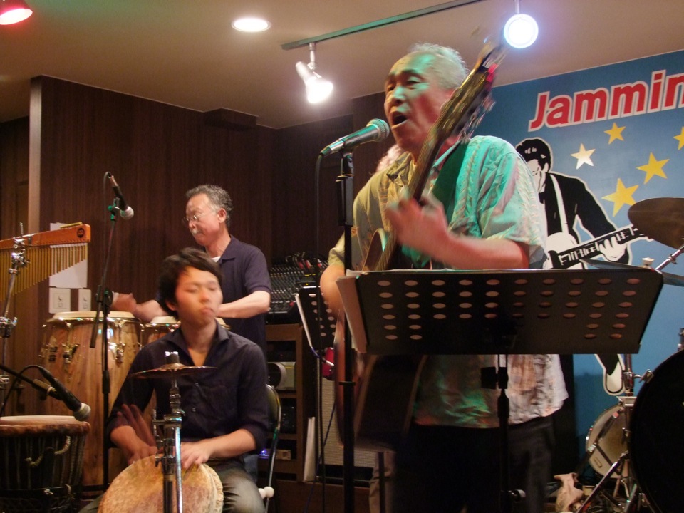 そして、このステージのハイライトは、ミキヤが参加しているという、高校生によるバンドの演奏です。…とは言え2曲だけの演奏でしたが(笑)、ミスター・ビックの曲を取り上げる等、インパクト的に強烈なものを残してくれました。高校2年生のミキヤがドラムを務め、後の3人は高校3年生という布陣も大したものです。高校生らしい勢いのある演奏と、とにかく音楽が好きであるという思いは、誰にも負けてない感じがしたものです。ビートにも重みがあって、いい感じだったと思います。このボーカルの子と UNIT メンバーでも“Little Wing”というカバー曲を1曲やりまして、それも盛り上がった時間でした。なかなか良い感じでライブが進んでいっているではないですか♪
