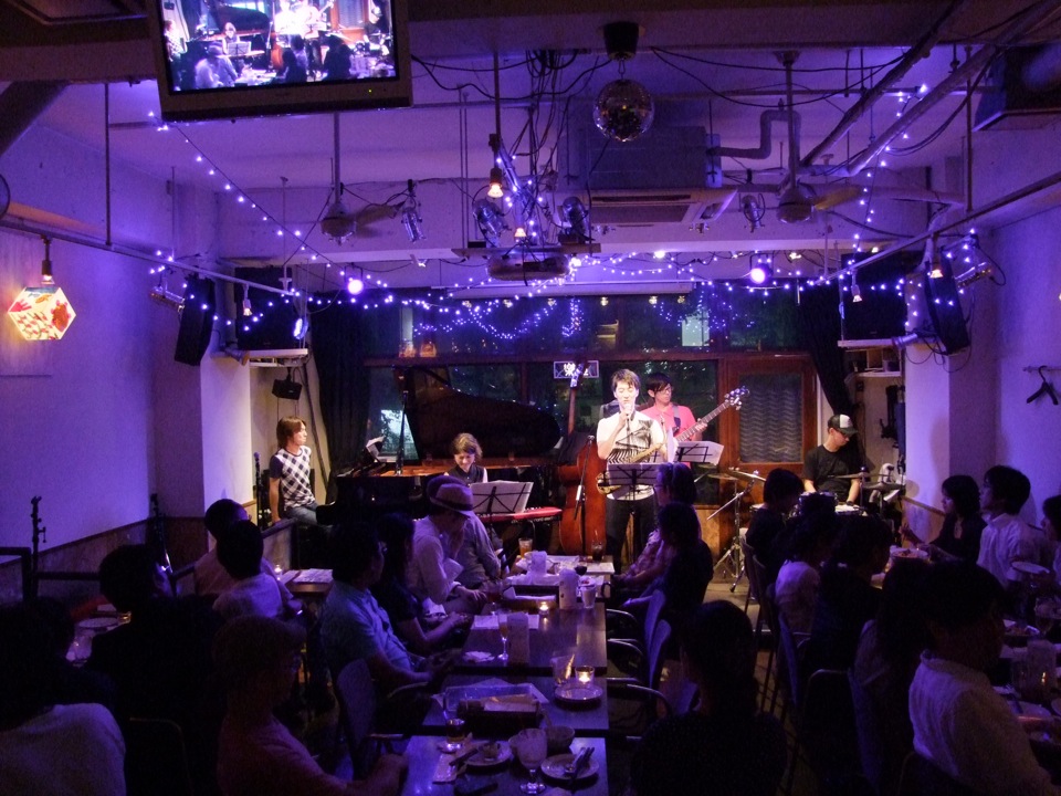 しかし、その“静かに”…は、本番直前で打ち砕かれました。最初のステージは Deep River にやって貰う事になっていたのですが、その前に、今回のライブの主旨を説明しておく必要があると思い、郷原君と自分とで、少しステージ挨拶をさせて頂く事にしていたのです。…まあ、それ自体は良かったのですが、本番5分前くらいになって、先程外に出掛けて行ったベースの池田君から電話があり、「俺、お店に財布忘れてないですかね」…と言うではありませんか。財布を忘れて出て行ったのは知っていましたが、なんと、現在サイゼリヤにいて、財布が無いので支払えない…と言うのです(笑)。何故にこんな時に!…と思いましたが、自分が届けに行く他はありません。…と言うのは、今日出演するメンバーは、自分と池田君以外はもう、Deep River としてステージに上がらなければならなかったのですから…。