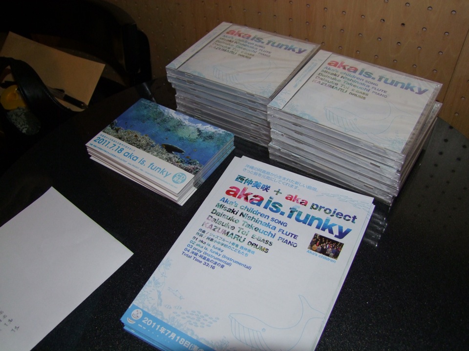 会場は大盛り上がりの内に、西仲さんのレコ発ライブは終了しました。お酒も飲んで、食事もそこそこ出来て、CDもゲット出来て、音楽も聴けて(踊れて…?)…、盛り沢山でしたね…。今回、この“aka is. funky”というCDは、今日と同じ日に阿嘉島でも発売される予定ではあったのですが、台風の影響で島へのフェリーが全て欠航…、まだ届けられないという状況になっているようです。それでも、まずは東京で西仲さん本人からCDの御案内が出来たという事で、この作品に関わった多くの方々(自分も含めて)も胸を撫で下ろしている事でしょう。これからは、CDという作品を通じての活動という、新たな使命も生まれてきて、ますます忙しくなるばかりだと思いますが(西仲さんは、早速明日からプロモーションの為に沖縄に行くみたいですし)、だからこそ今後の展開が楽しみではないですか!!…色々な可能性の追求を期待してます。ひとまず、“aka is. funky”発売、おめでとうございました!