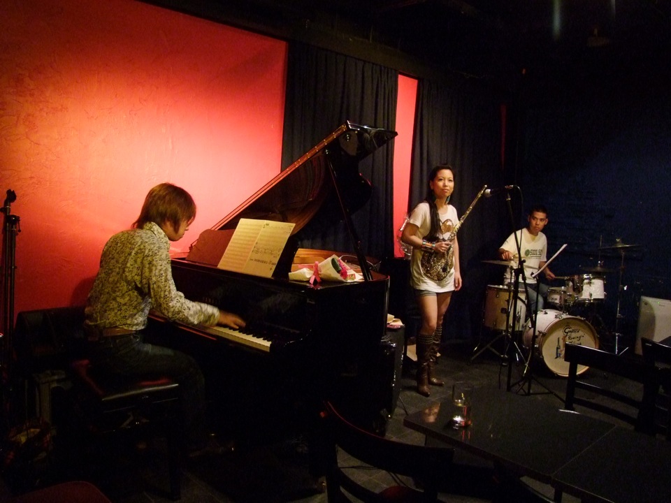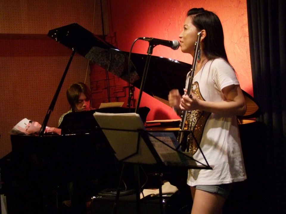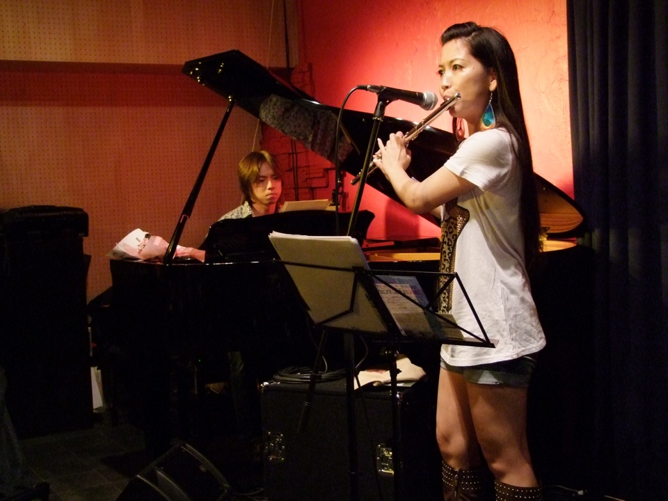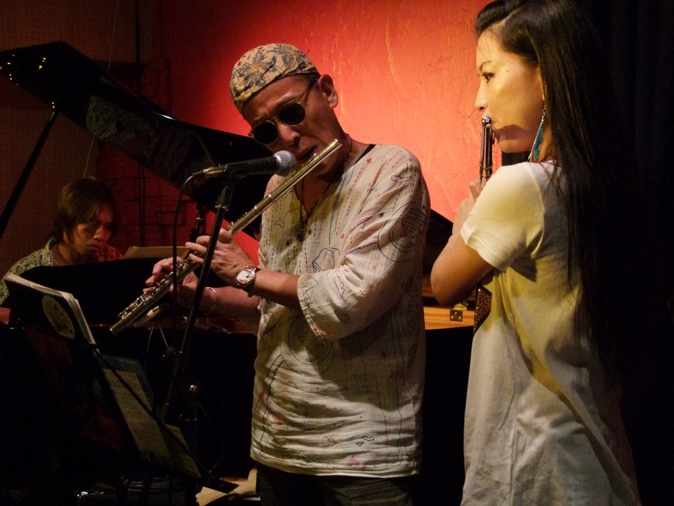そして、ある意味で特筆的な出来事というのが、この2ステージ目に凝縮されていたような気がしました。沖縄民謡である“てぃんさぐぬ花”演奏時に、お客さんで西仲さんの知り合いの沖縄出身の方がいて、急遽歌うように促したり、その後西仲さん自身も歌い出したり(珍しい…)、別の曲で、フルートを持って遊びに来ていたお客さんとセッションをしてみたり、また別の曲で(“谷茶前”だったと思います)、自然発生的にお客さん側から手拍子が始まり、そのノリがいつしか、会場全体で立って踊り出す(エイサー的な…)ような雰囲気になっていったり…。前回の沖縄ツアー〔西仲美咲、沖縄ツアー(2011.414~4.16) 参照〕の一幕を見ているようでもありました(笑)。しかし、ここは東京の三軒茶屋という場所で、しかもジャズを基本的に演奏するというライブハウスの中なのです。なかなかこんな絵は見られないでしょう。これが沖縄パワーなのではないでしょうか。
