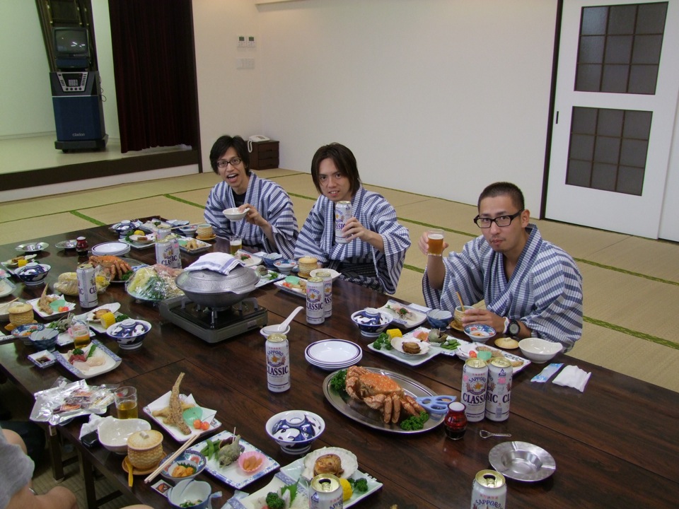教会に寄りつつ旅館に戻り、待ちに待った夕食会です!…今回のコンサートは、伊達メセナ協会という、伊達市のNPO法人によって企画されているものなのですが、その専務理事の方や、会長さん等をお招きして(いや自分達が招かれているのか…)、人数こそ少ないものの、盛大に行われました。自分達も先にお風呂に入っておいて、浴衣にも着替えて、準備万端です(笑)。ビール、そして日本酒とお酒を入れまくり、これぞ海の幸!…というくらいに並べられた食事に舌鼓を打ちつつ、楽しい時間を過ごしたものでした。