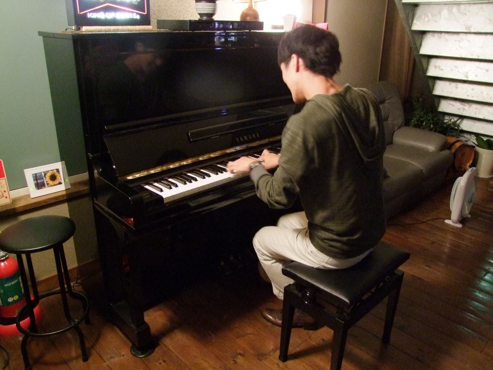 ビールは勿論、ワインやら日本酒やらが出てきて、食べ物にしても、海の幸から野菜、そして肉までも…至れり尽くせりとは正にこの事でしょう。そして、皆で調子が出てきたのか、お店に置いてあったピアノを用いて、郷原君に弾いてくれと促し、彼自身の結婚式の時に披露してくれた“弾き語り”の曲〔今こそ明るいニュースを…参照〕を再現させてみせました(笑)。…これがもう…、いや~、、、笑い 感動しました。あっという間に時間が経ってしまいました♪