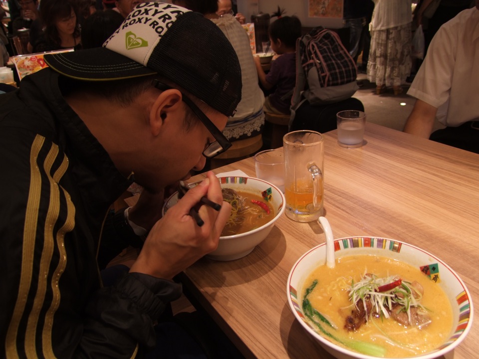 そんなこんなで、新千歳空港に着きました。また来年…と別れ、郷原君とも別れ(笑)、後は飛行機にチェックインするだけです。またもウッドベースの預け入れに手間を要しますが、その間にも自分とトシさんは、空港内にある札幌ラーメン街のエリアに足を運んでいきます(当然、一杯やりました…笑)。ここ最近、新千歳空港はリニューアルを果たし、空港ターミナルも拡張され、見所も以前より多くなっていたからです。今の今まで、札幌ラーメンを食べていないで良かったと思いました(笑)。